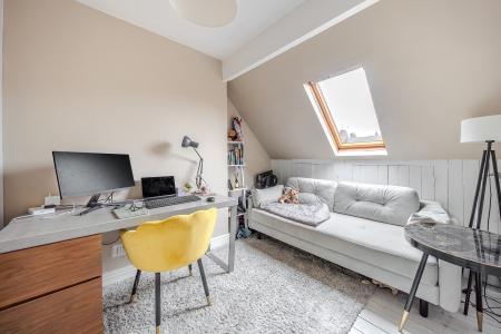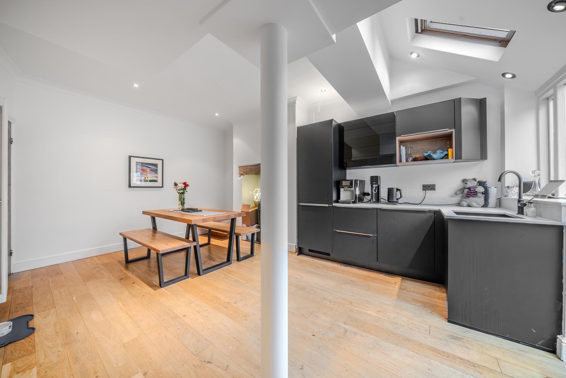 The kitchen itself has been finished to a high standard with bespoke cabinetry, premium integrated appliances and a sleek, contemporary design. Velux roof windows flood the space with natural light, enhancing the sense of quality and openness. A clearly defined dining area provides an ideal space for entertaining, while French doors open directly onto the low-maintenance, south-facing rear garden, creating a seamless connection between indoor and outdoor living. A wood-burning stove adds warmth and character to this superb living space.