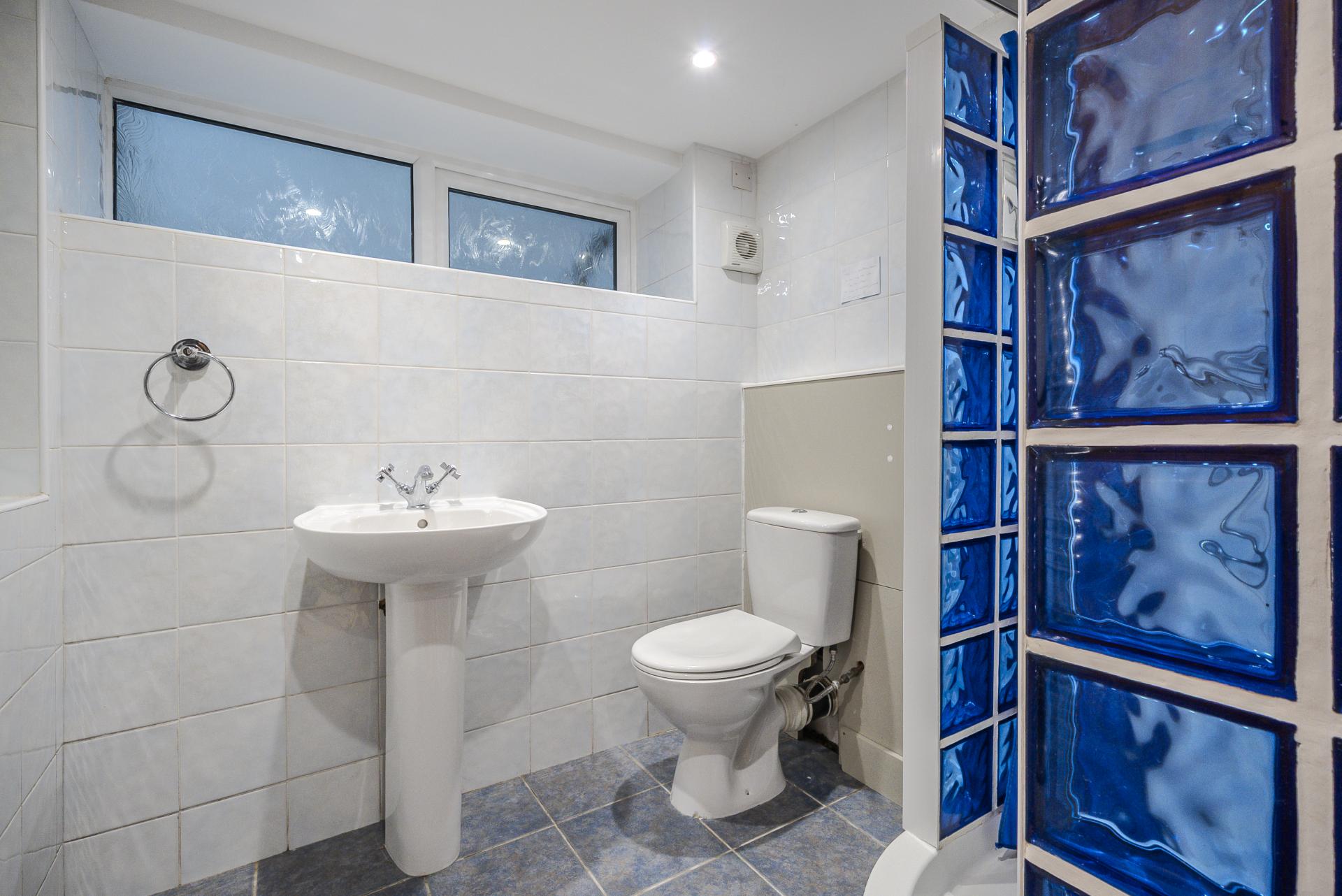 With WC, washbasin and shower.