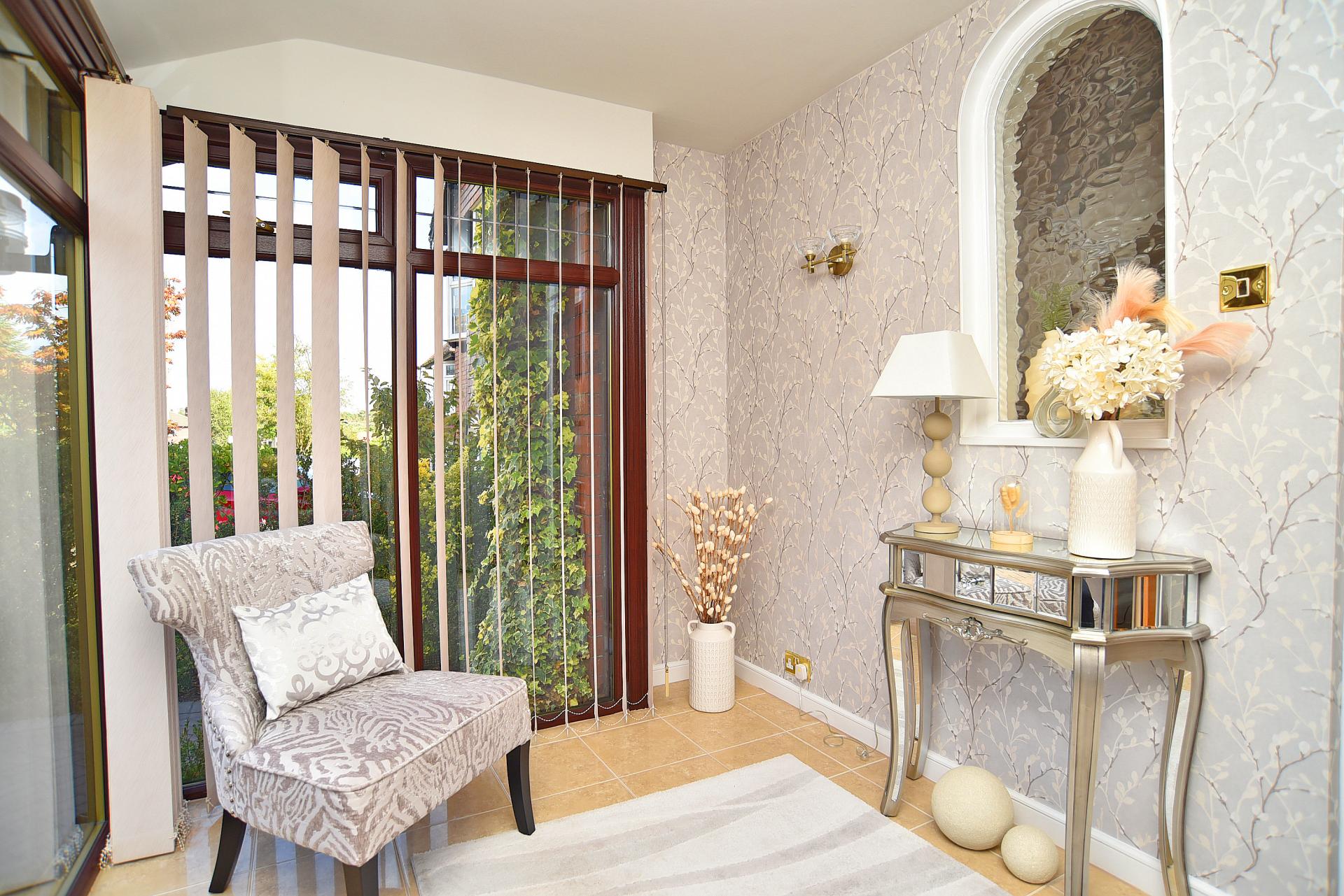 A spacious entrance porch with tiled flooring leads to the reception hall, which includes an under-stairs cupboard.