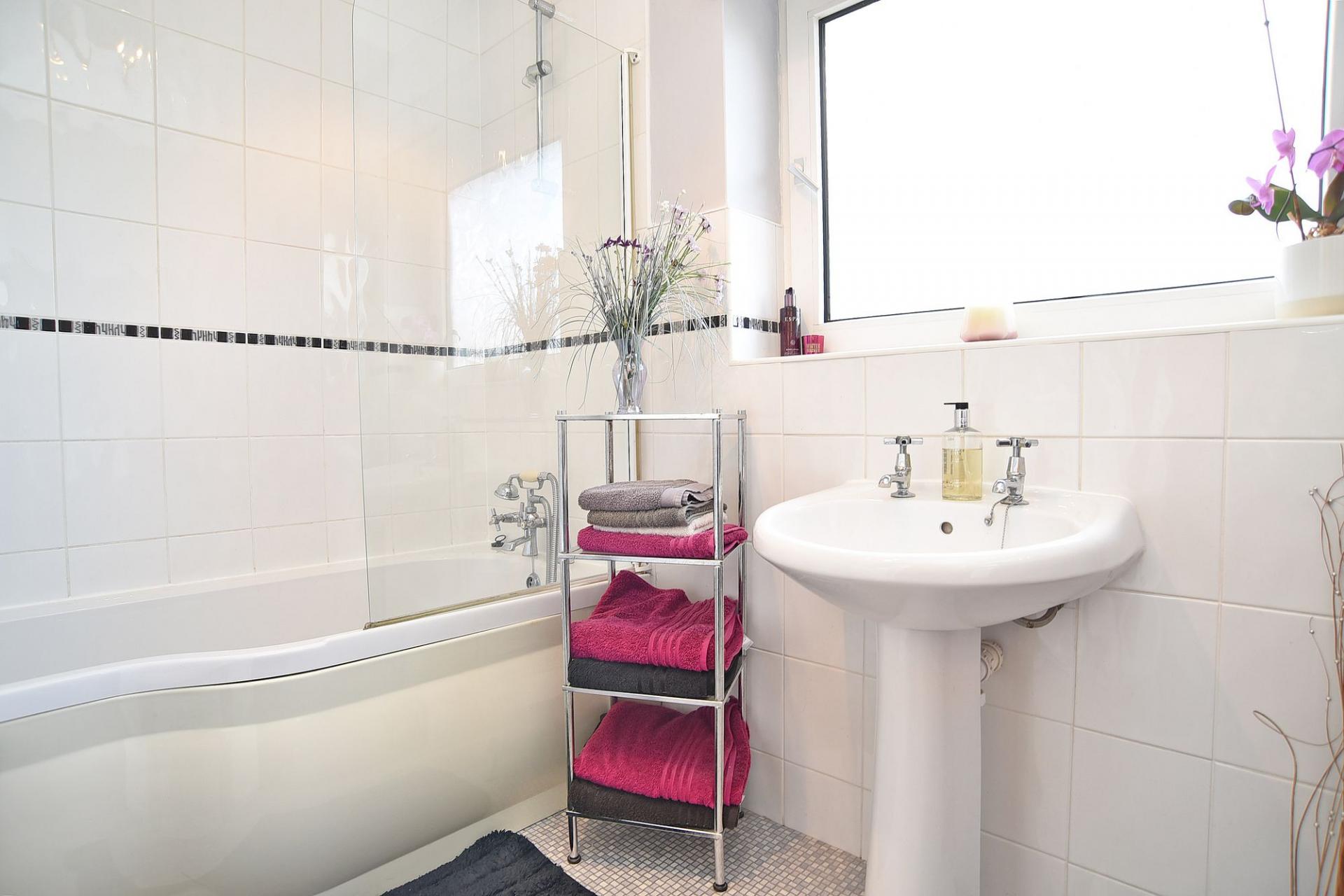 A modern white suite comprising basin and bath with shower above.