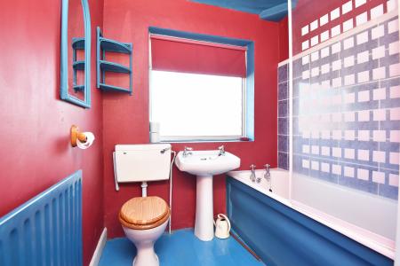 A white suite comprising WC, basin and bath with shower above. Fitted cupboard.