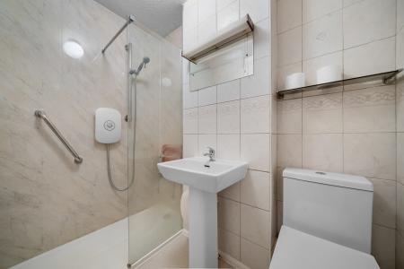 There are two well-proportioned bedrooms, with the principal bedroom benefiting from built-in wardrobes and good natural light, while the second bedroom offers flexible use. The bathroom is fitted with a three-piece suite comprising a low-level WC, pedestal wash hand basin, and a walk-in shower with glazed screen, and is fully tiled for ease of maintenance.