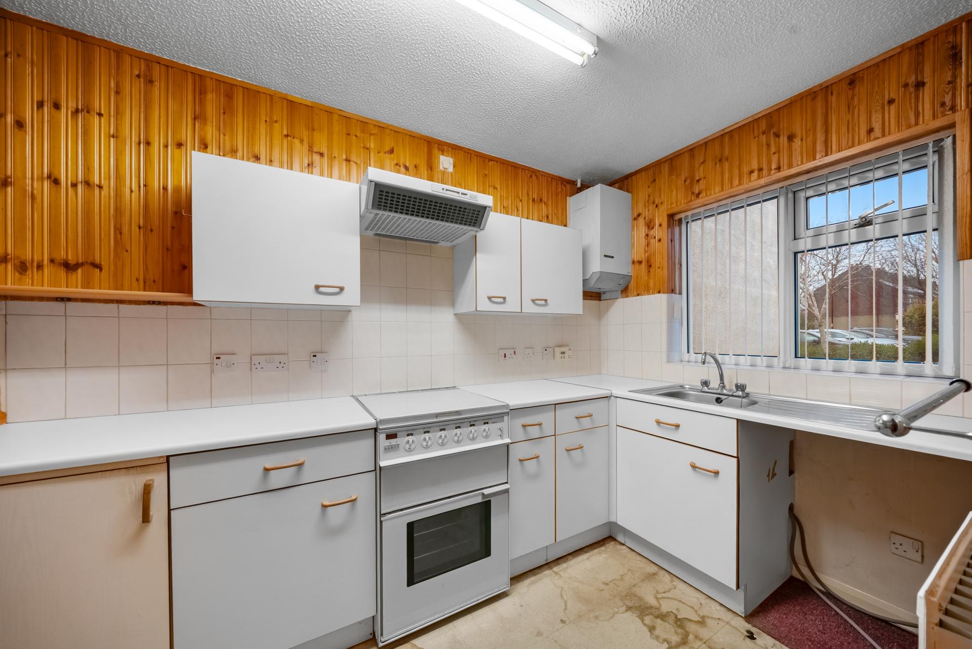 The kitchen is fitted with a range of wall and base units with complementary work surfaces, incorporating a sink unit and space for freestanding appliances, with a window providing natural light. The sitting room is bright and spacious, offering an excellent main living area with ample room for living and dining furniture.