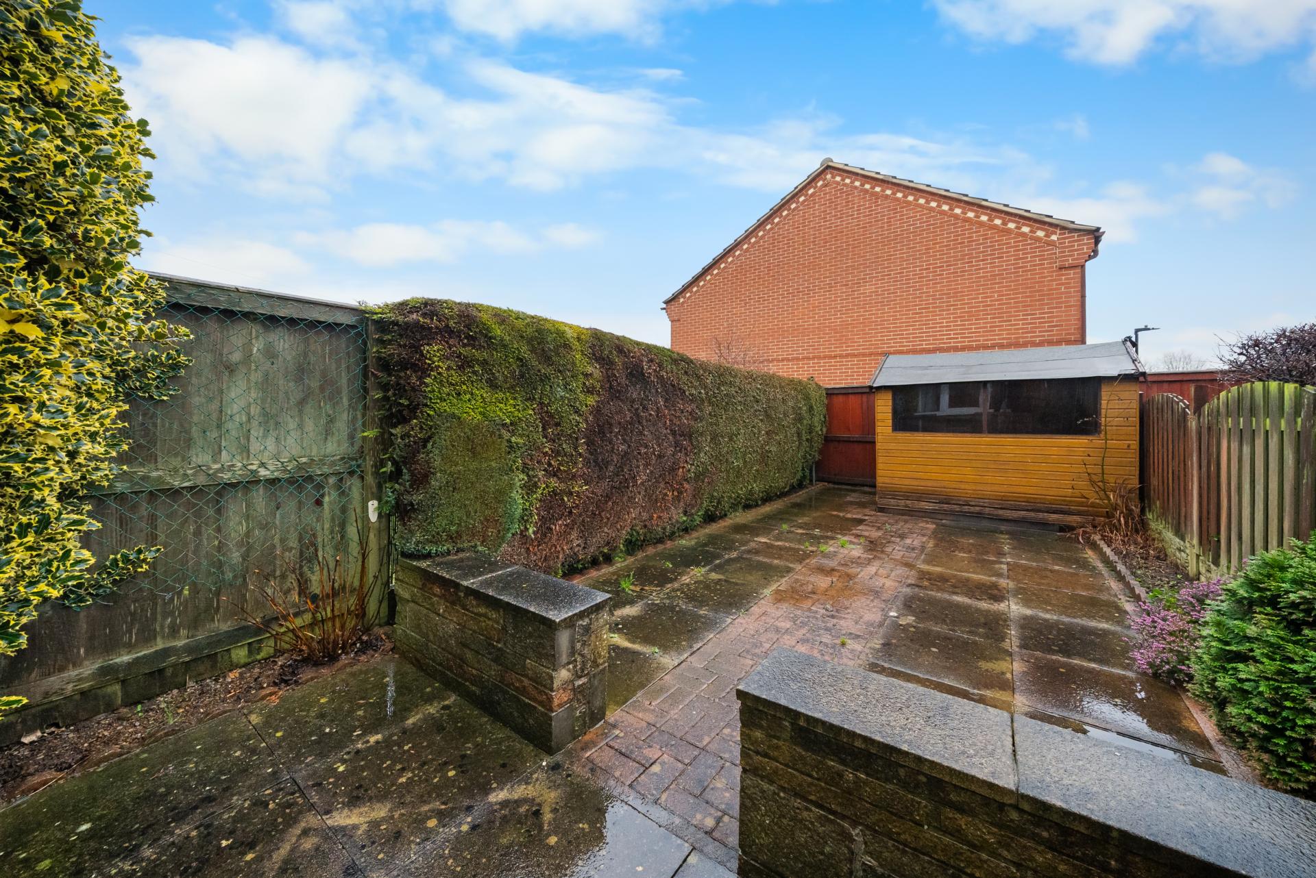 OUTSIDE To the rear is an enclosed garden, primarily laid to paved seating areas for ease of maintenance, with fenced and hedged boundaries providing a good degree of privacy, along with a useful timber shed.