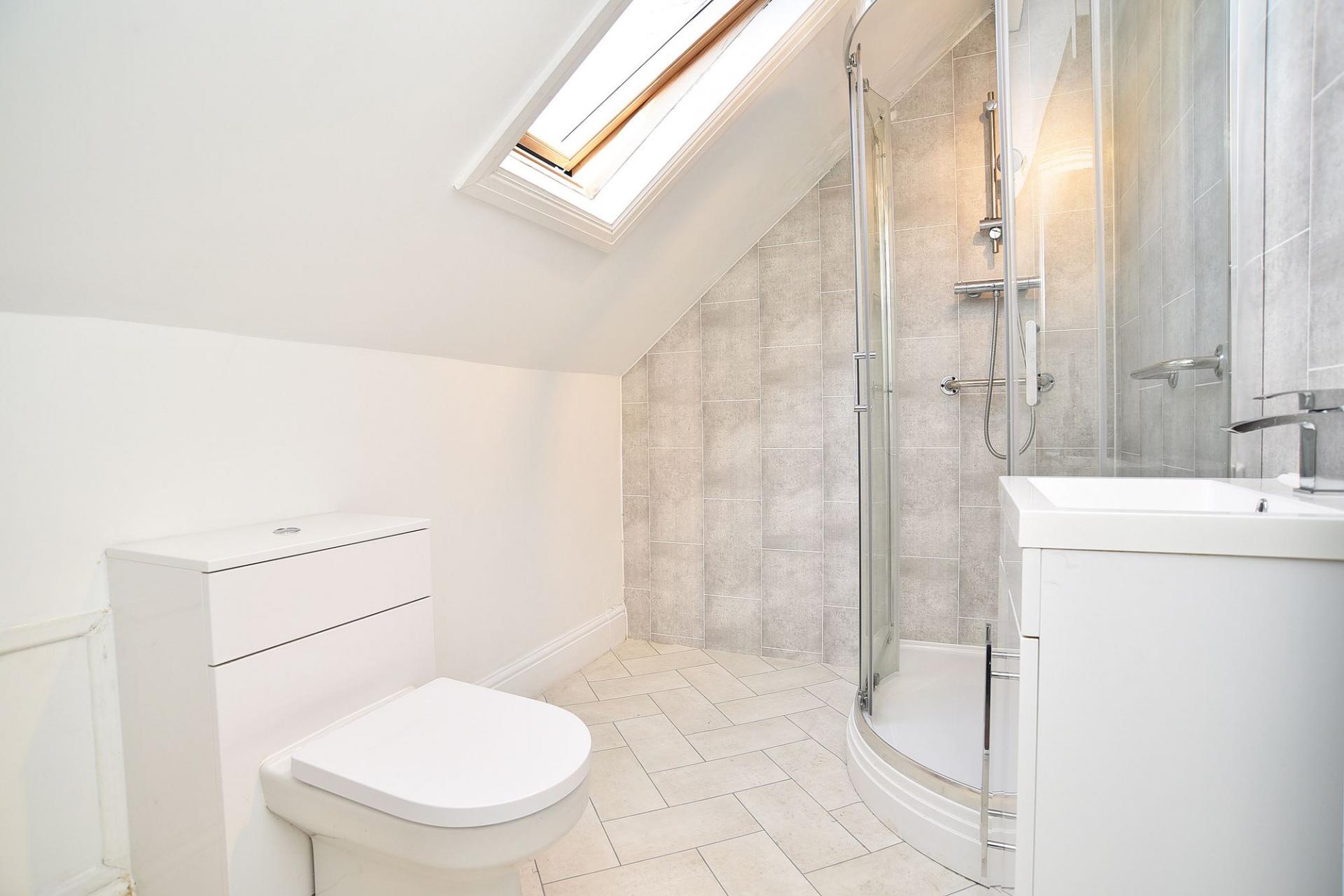 A white modern suite comprising WC, washbasin set within a vanity unit and shower. Velux window. Central heating radiator.