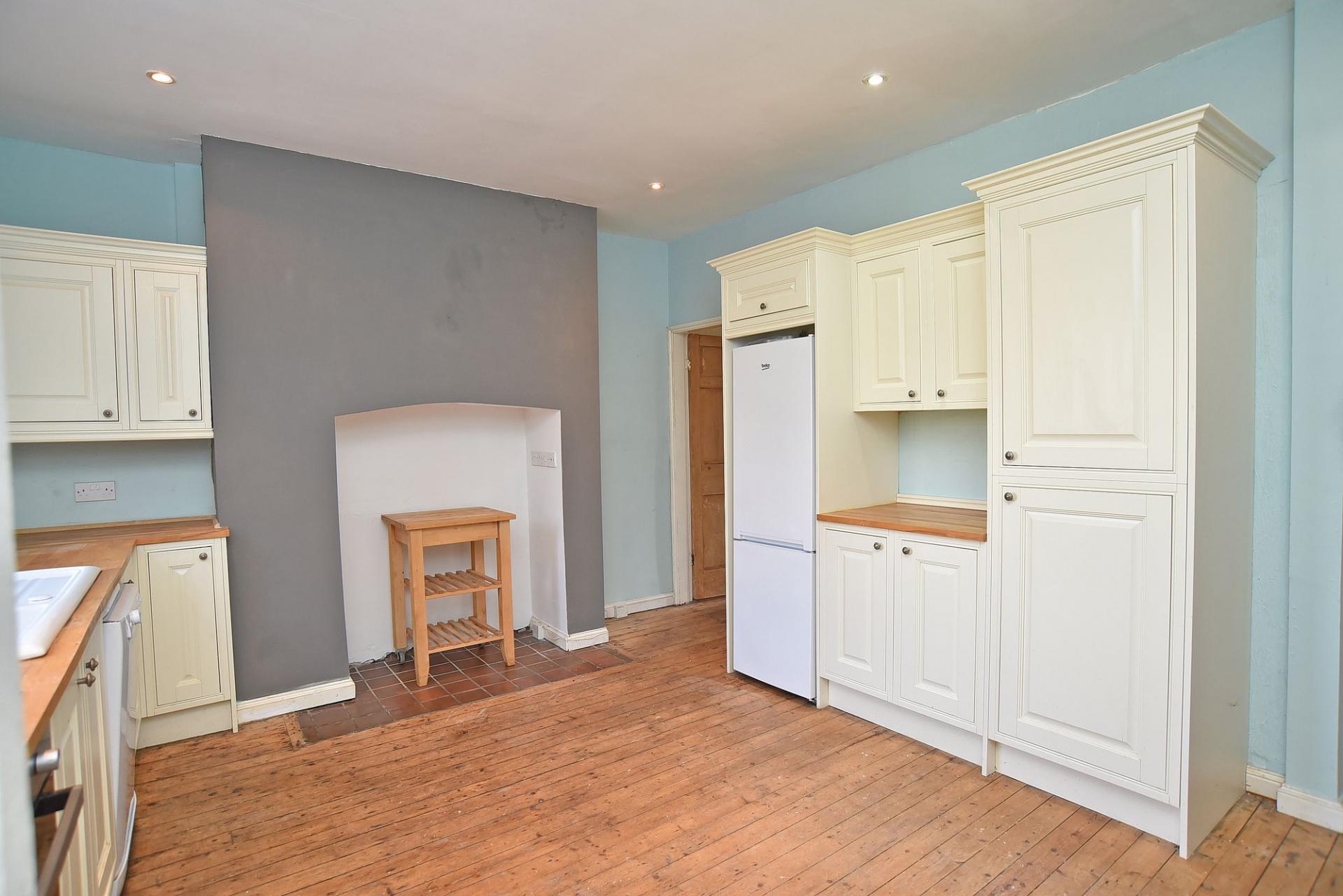Window to rear. Extensive range of modern fittings comprising base cupboards with work surfaces above having inset single-drainer stainless-steel sink unit with tiled splashbacks and matching wall-mounted units. Built-in electric hob with oven below. Plumbing for dishwasher. Exposed tongue-and-groove floorboarding. Central heating radiator. Low-voltage spotlighting to ceiling.