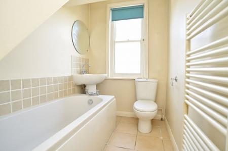 Window to rear. Modern suite in white comprising panelled bath with tiled splashback, pedestal washbasin and low-flush WC. Tiled floor and ladder-style heated towel rail.