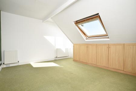 A large double bedroom with skylight window and window to front, fitted wardrobes and ornamental fireplace. Central heating radiator.