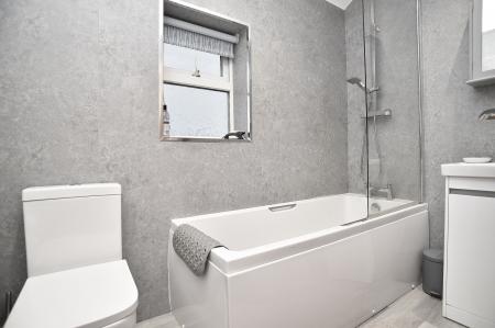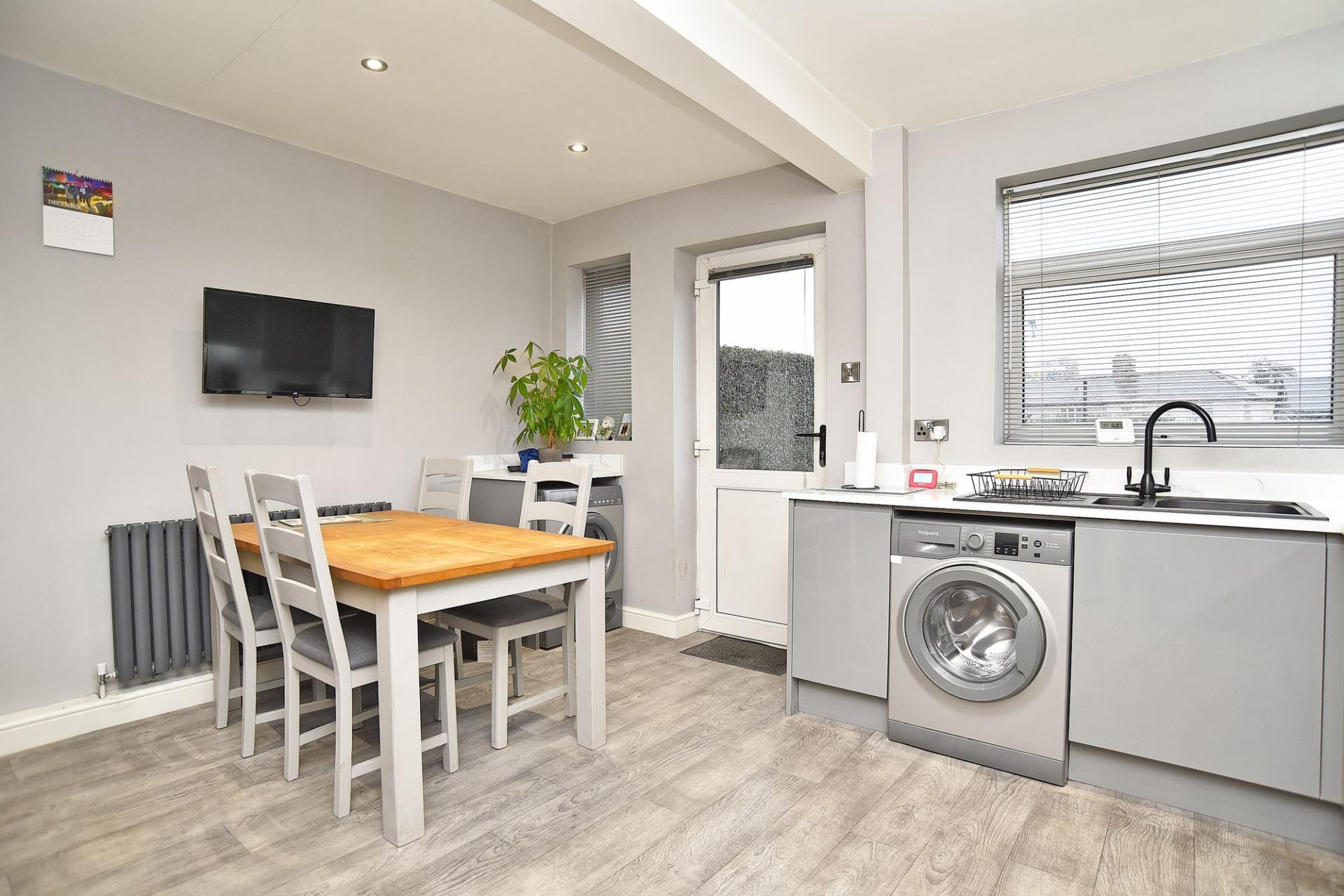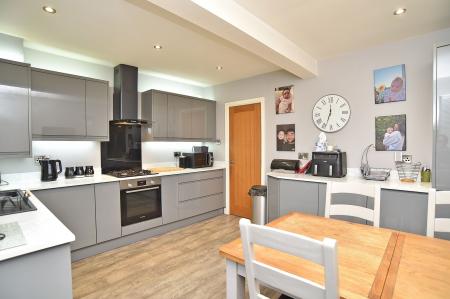 Fitted with a modern range of wall and base units with working surfaces having inset 1.5 sink and drainer. Four ring gas hob with oven under and extractor fan over. Integrated fridge freezer and plumbing and space for washing machine and tumble dryer. Space for family dining table. Window to rear elevation. Rear access door.