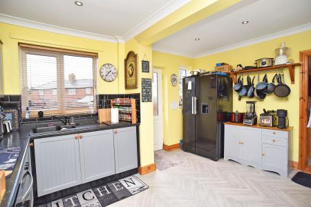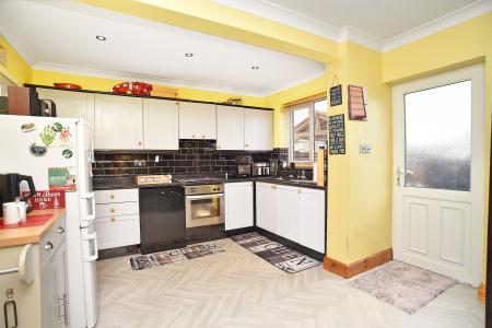 Two double-glazed windows to rear and exterior door leading to the large rear garden. Modern fittings comprising base cupboards with work surfaces above having inset single-drainer sink, tiled splashbacks and matching wall-mounted units. Built-in hob with oven below and extractor hood above. Plumbing for dishwasher. Central heating radiator and coved ceiling.