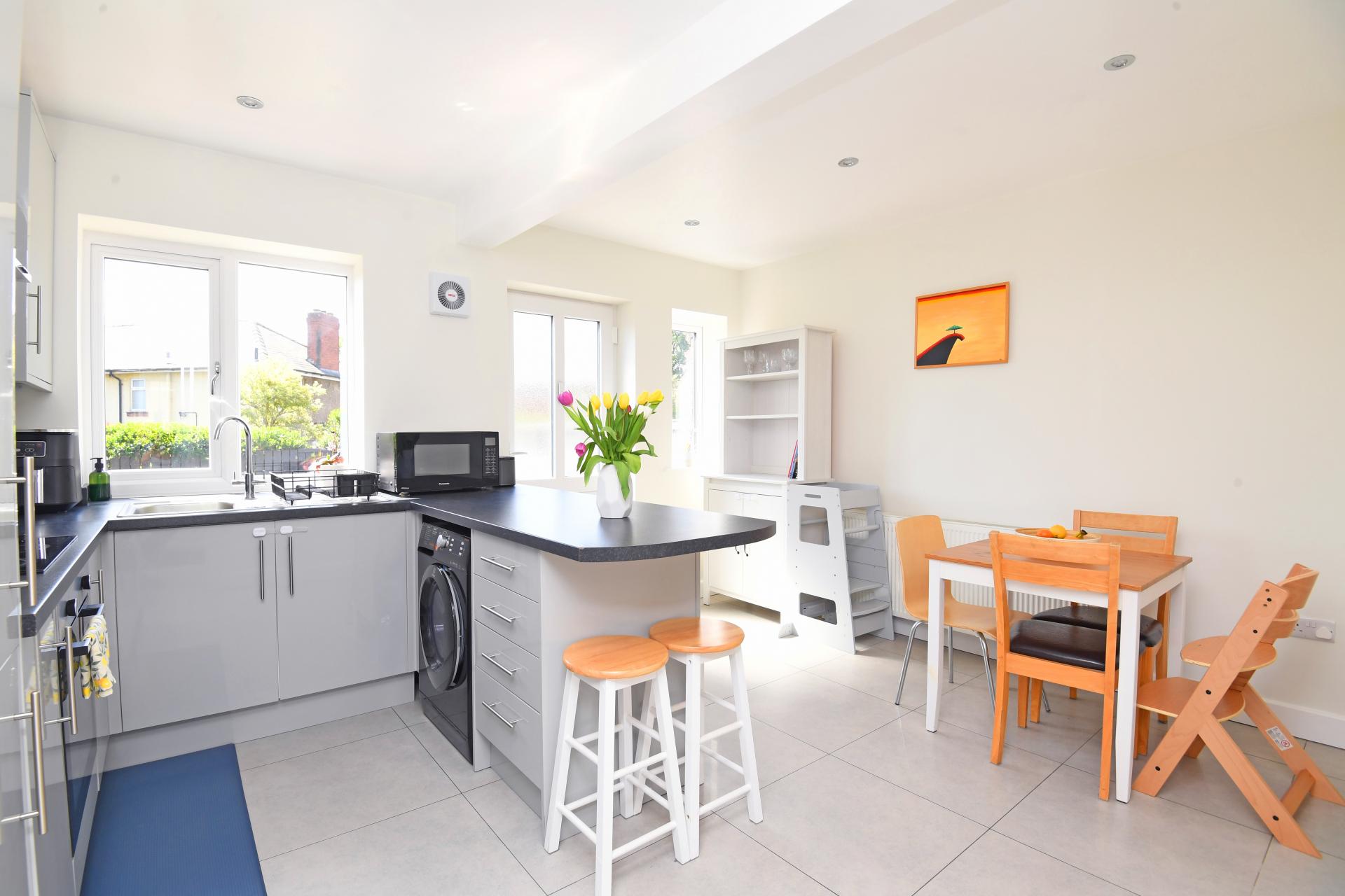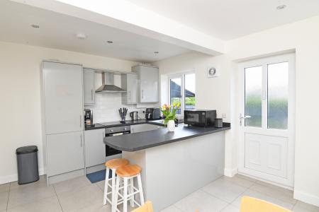 An open plan living space with dining area, windows to rear and door leading to the garden. Stylish, modern fitted kitchen with worktop and breakfast bar. Electric hob and oven and extractor hood above. Integrated fridge and freezer and plumbing for a washing machine.