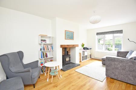 A spacious reception room with windows to front and rear and wood-burning stove.