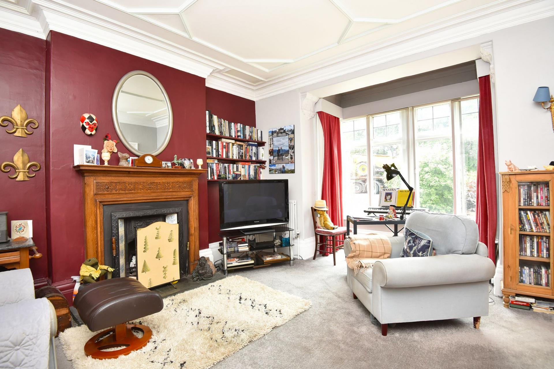 An attractive reception room with bay window and feature fireplace with open fire.