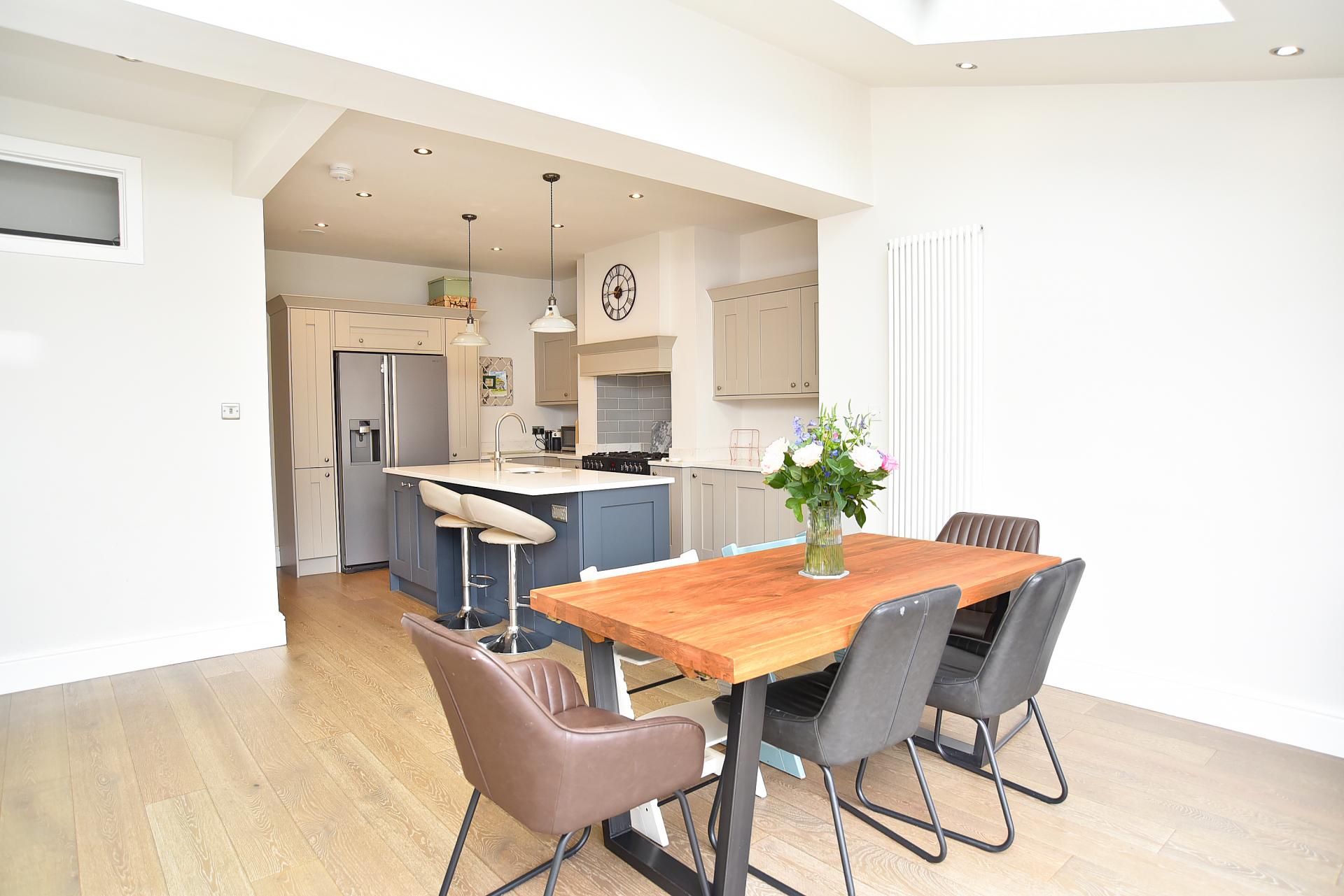 A stunning open-plan kitchen and living area with sitting and dining space. Glazed bi-folding doors lead to the garden. The kitchen comprises a range of stylish fitted units with quartz worktop, island and breakfast bar, range cooker and integrated dishwasher.