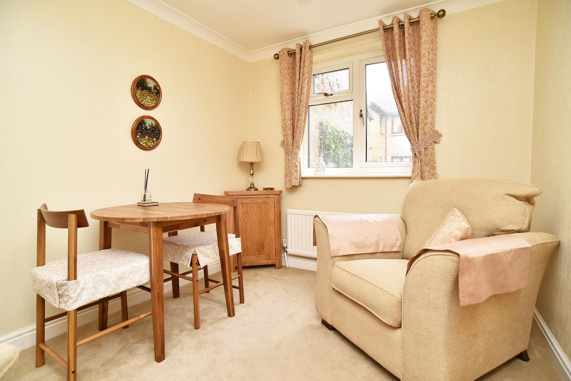 A spacious open-plan living space with space for sitting and dining areas. Glazed doors lead directly to the attractive communal gardens. Fireplace with electric fire.