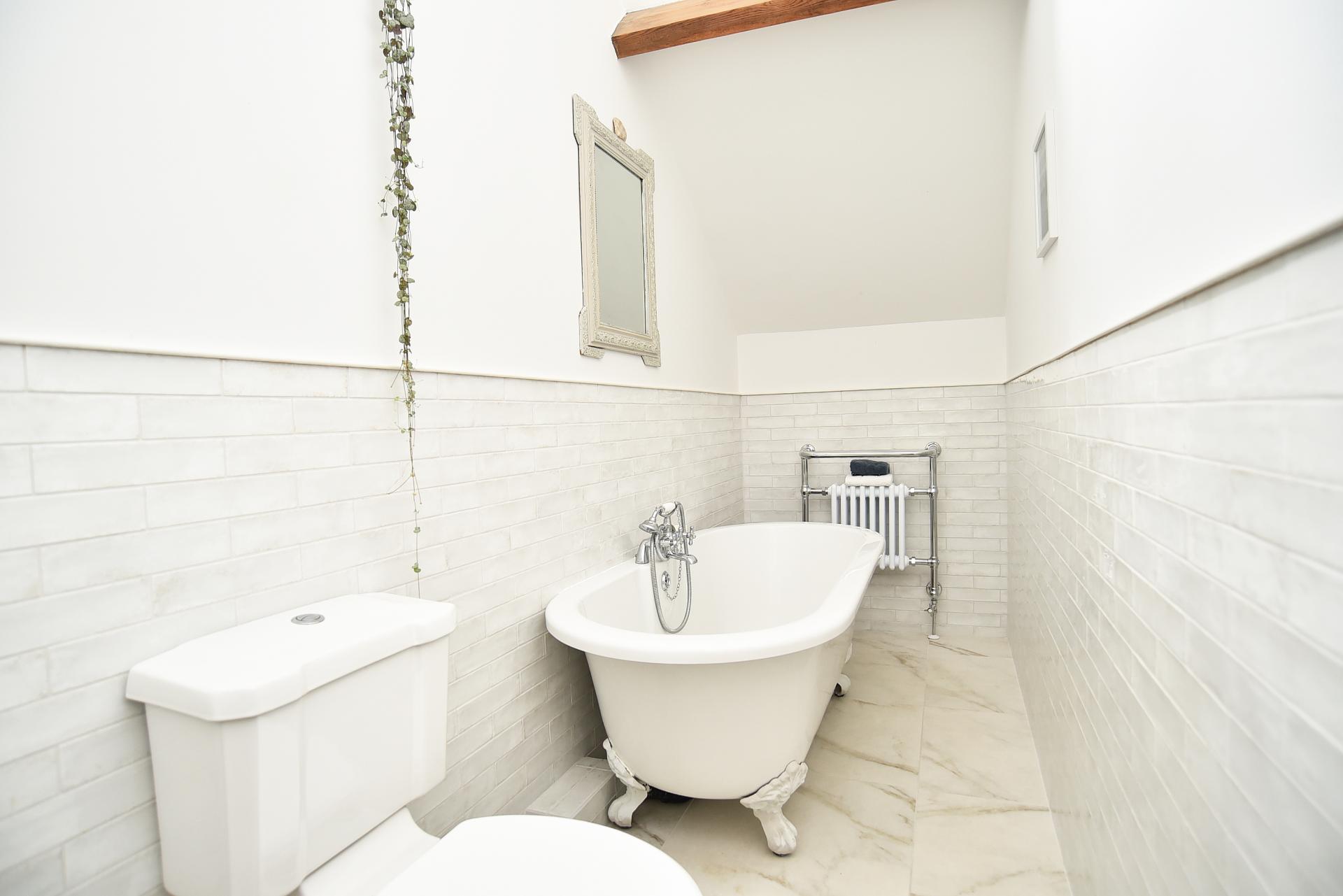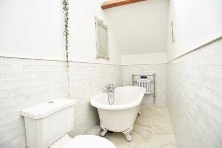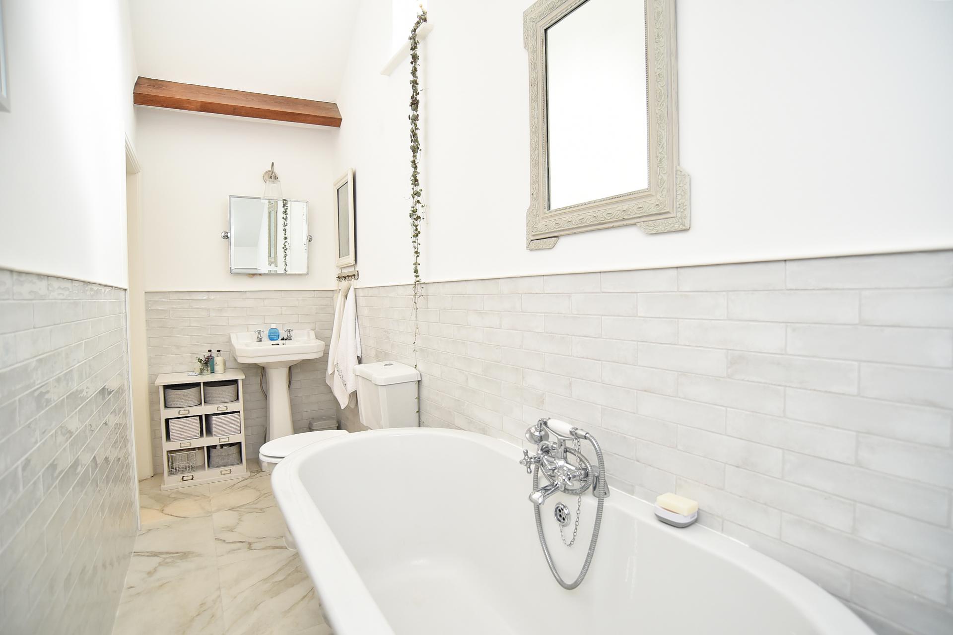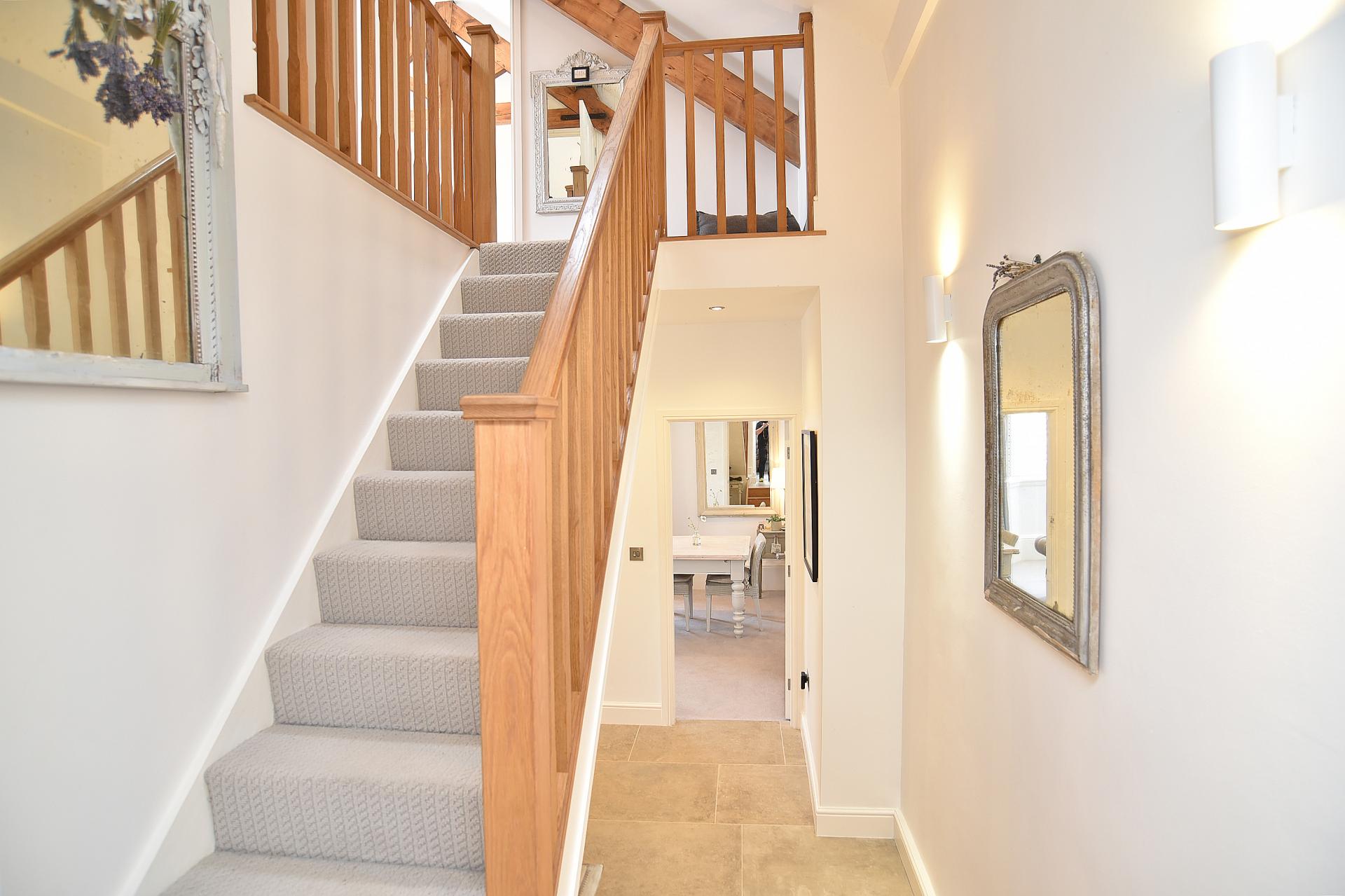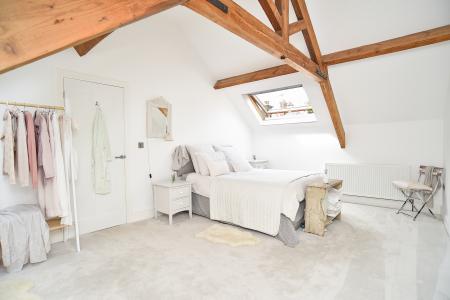 galleried landing with feature beams, bedroom one with feature beams and fitted wardrobes. Bedroom two and a modern house bathroom with a free-standing bath, marble tiled floors and porcelain tiled walls. Spacious split-level reception hall with feature customised oak steps.