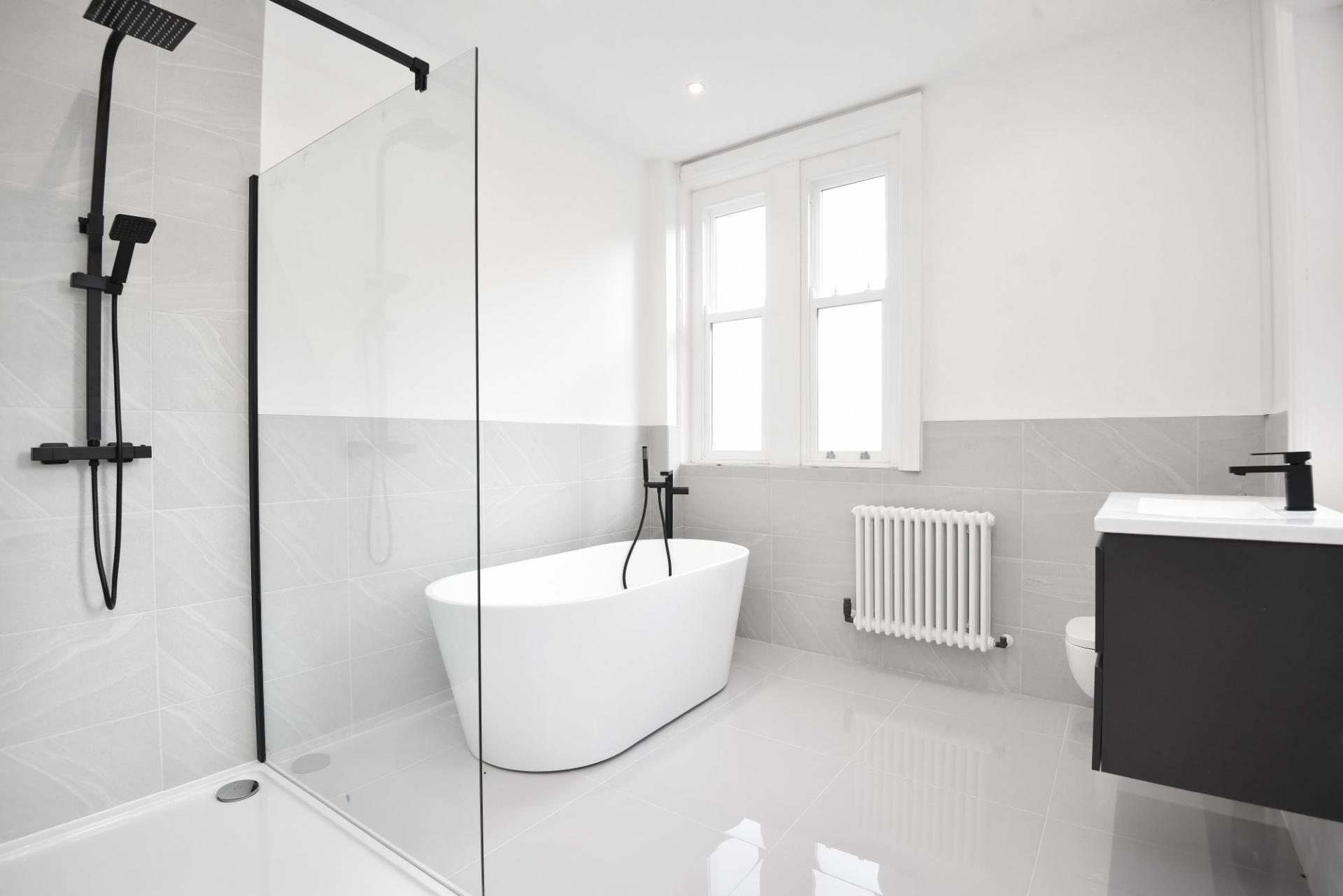 A white modern suite comprising WC, washbasin set within a vanity unit, shower and free-standing bath.