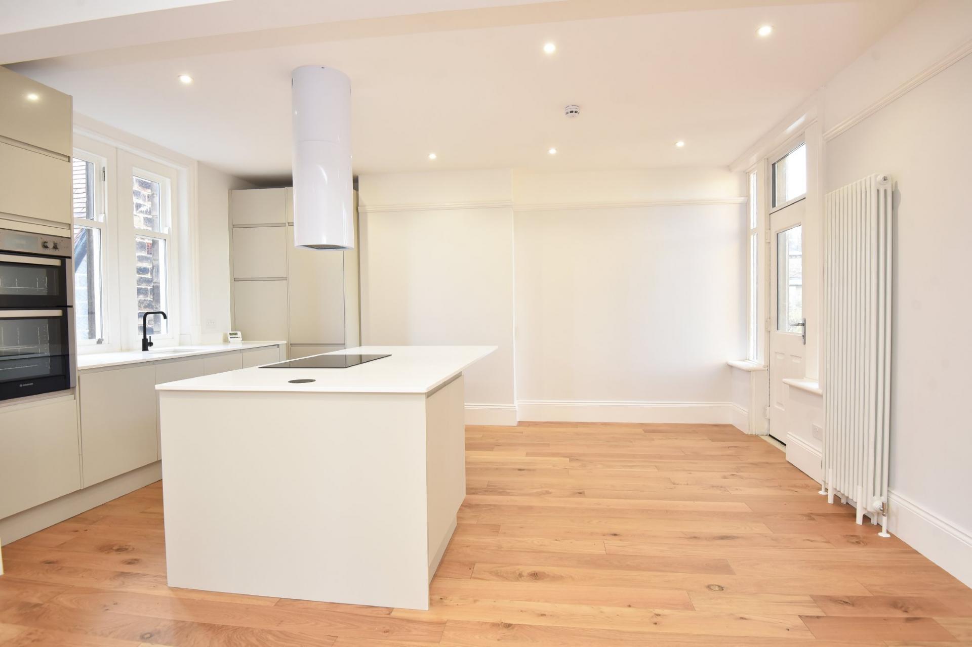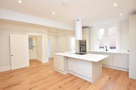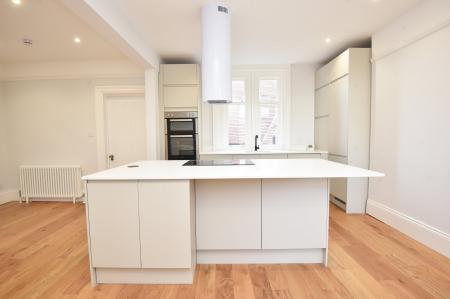 An impressive open-plan living and dining area with a modern fitted kitchen and glazed door leading to a large sun terrace overlooking the Stray. The kitchen comprises a range of stylish modern fitted units with island and breakfast bar. Induction hob, integrated double oven, dishwasher and fridge / freezer.
