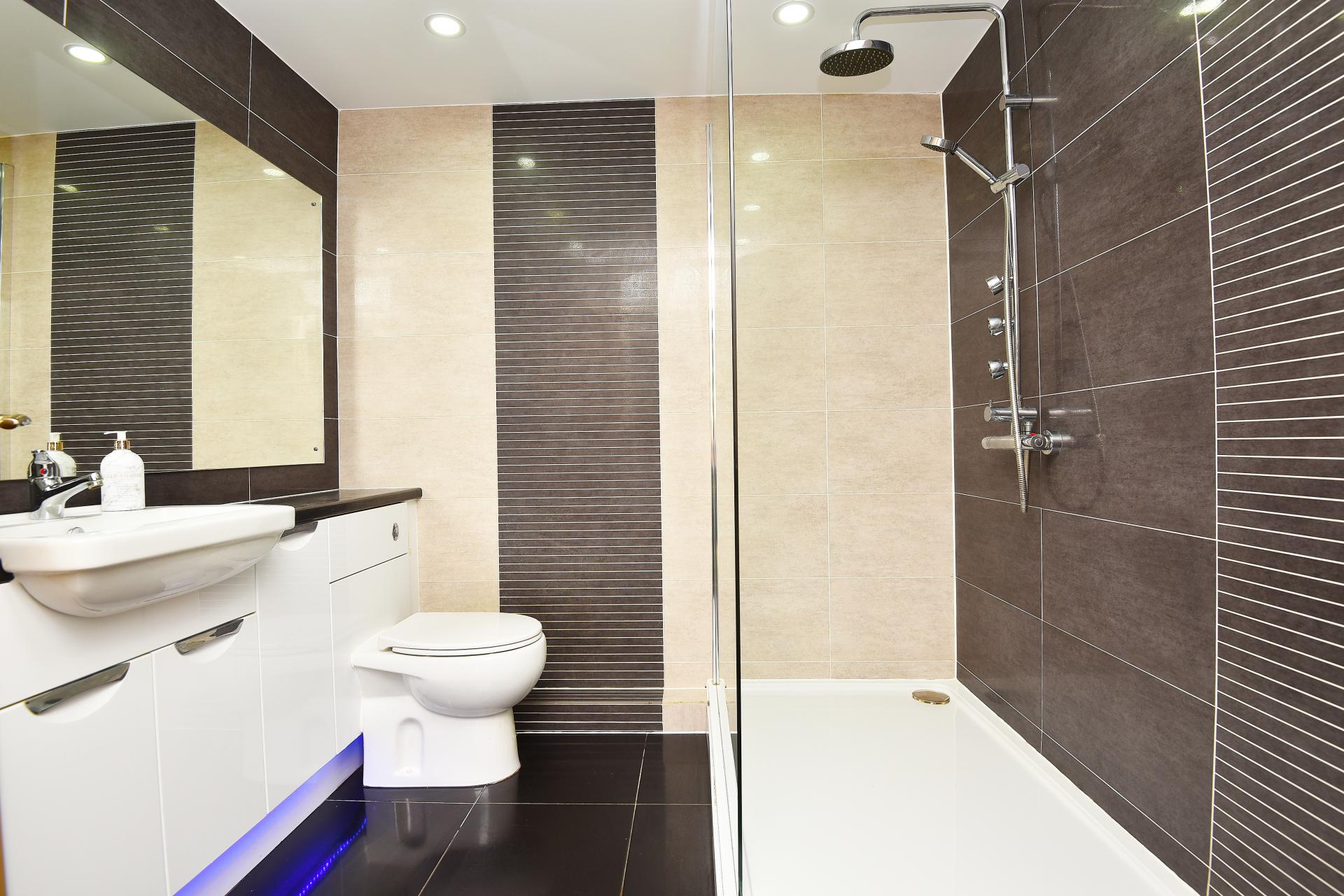 A modern white suite with WC, washbasin set within a vanity unit, and large shower. Tiled walls and floor. Heated towel rail.