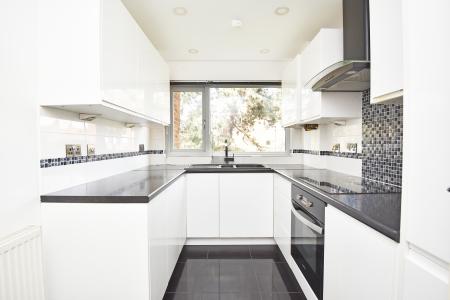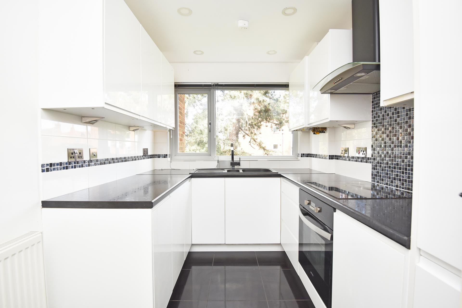 A modern kitchen with a range of fitted wall and base units with electric hob, integrated oven, fridge / freezer and dishwasher. Utility cupboard with space and plumbing for washing machine and tumble dryer.