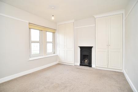 A large double bedroom with two double-glazed windows to the front, fitted wardrobes and feature period fireplace.