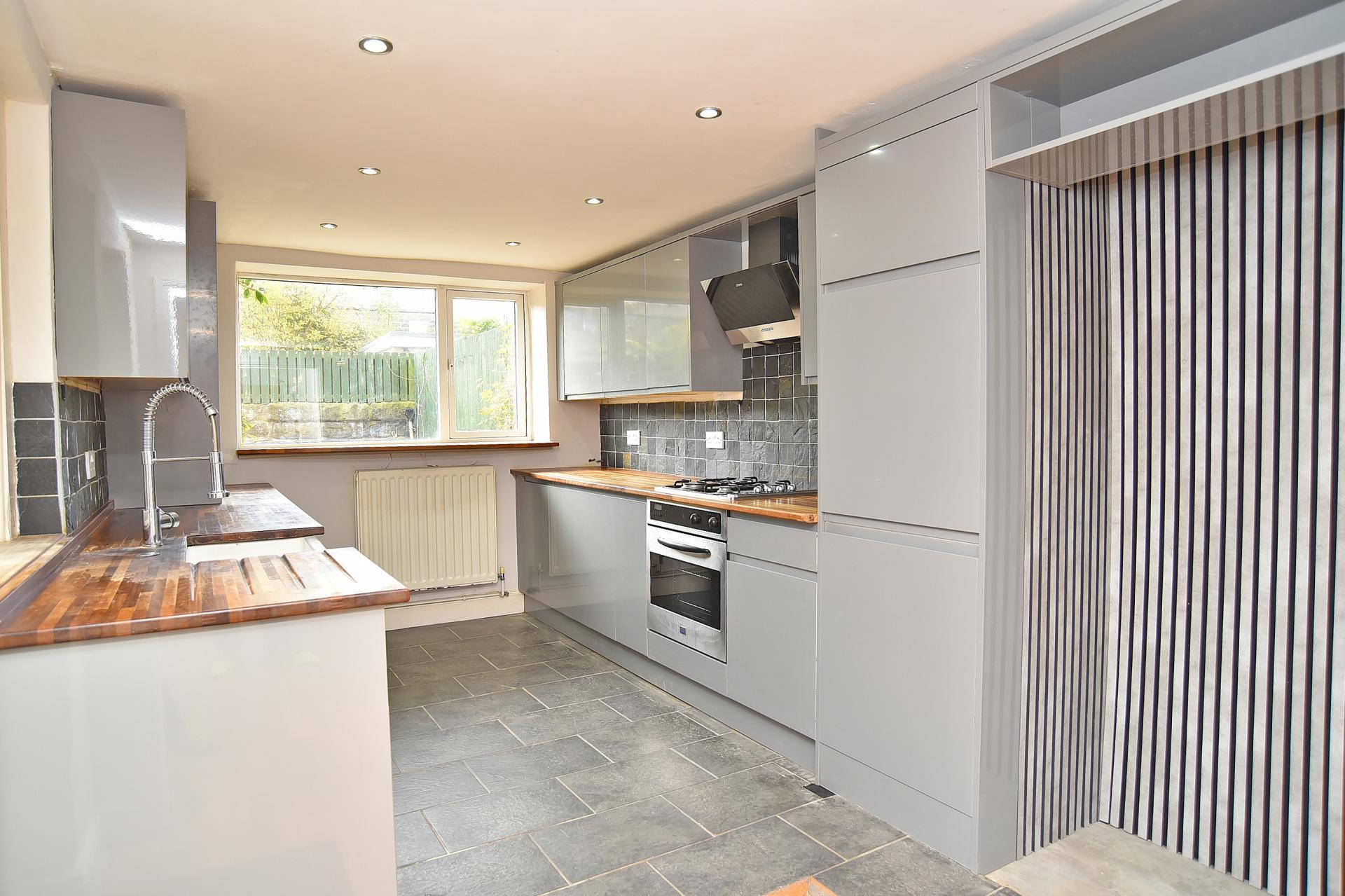 A modern fitted kitchen with double-glazed windows to the rear and side and external door to the side. The kitchen comprises a range of contemporary units with gas hob and extractor above, oven below, integrated fridge, freezer and slim-line dishwasher, and space with plumbing for a washing machine. Fitted cupboard housing the gas central heating boiler.