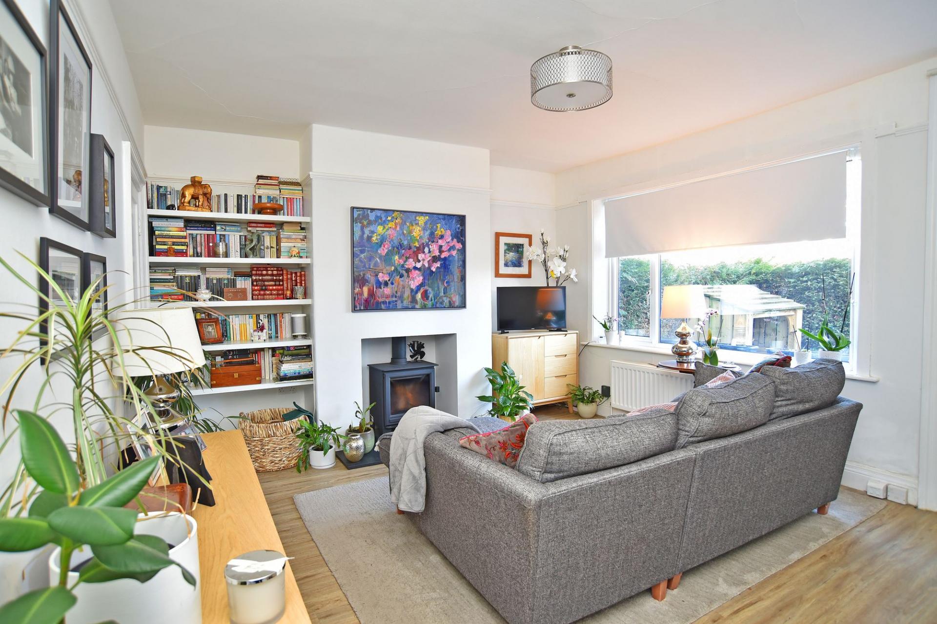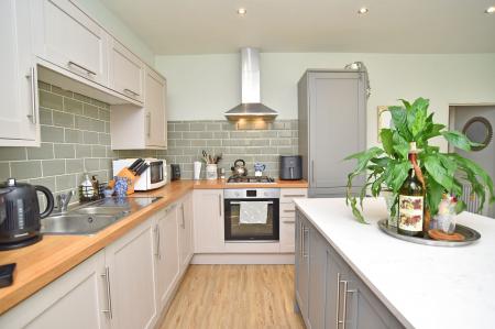 The spacious ground-floor accommodation comprises a large reception room with woodburning stove, window to the front and a fitted storage cupboard. To the rear is a generous dining kitchen fitted with a range of stylish wall and base units, incorporating an island and breakfast bar. Integrated appliances include a gas hob, oven, dishwasher, washing machine and fridge freezer. Leading off the kitchen is a conservatory which provides a further sitting area with views over the rear garden.