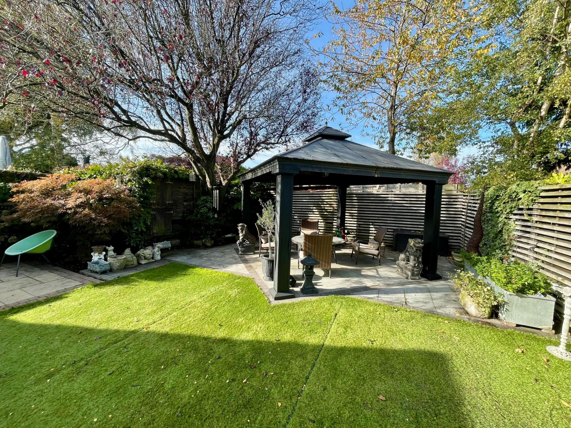 A driveway provides off-road parking and leads to the garden office. To the rear of the property there is a good-sized, enclosed garden with artificial lawn, gazebo covered sitting area with electric power and a paved patio, creating an ideal outdoor entertaining space.