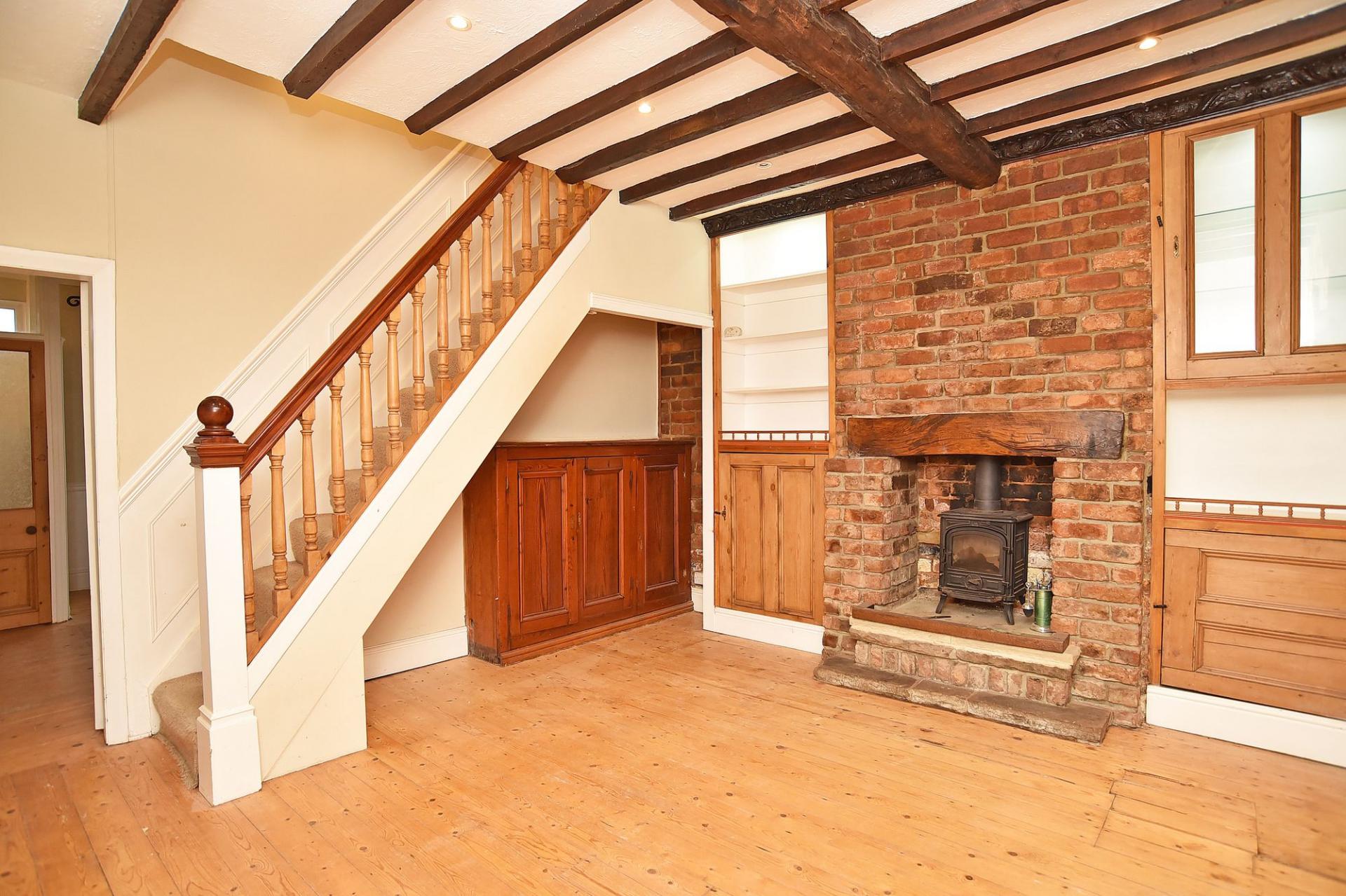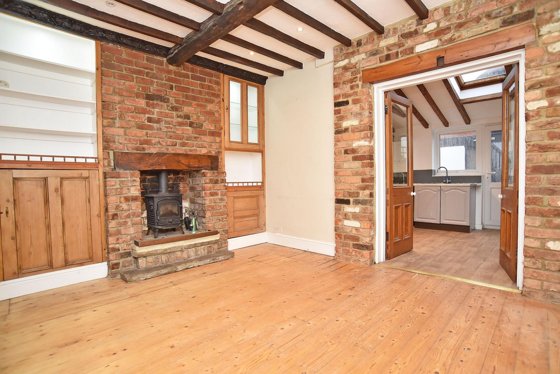The accommodation briefly comprises: entrance porch leading into a cosy sitting room featuring original floorboards, a character fireplace and tall sash windows providing excellent natural light. To the rear is a superb second reception room, ideal as a family or dining room, boasting exposed timber beams, exposed brickwork and a wood-burning stove set within an attractive brick fireplace. Double doors lead through to the kitchen, creating an excellent flow for everyday living and entertaining.