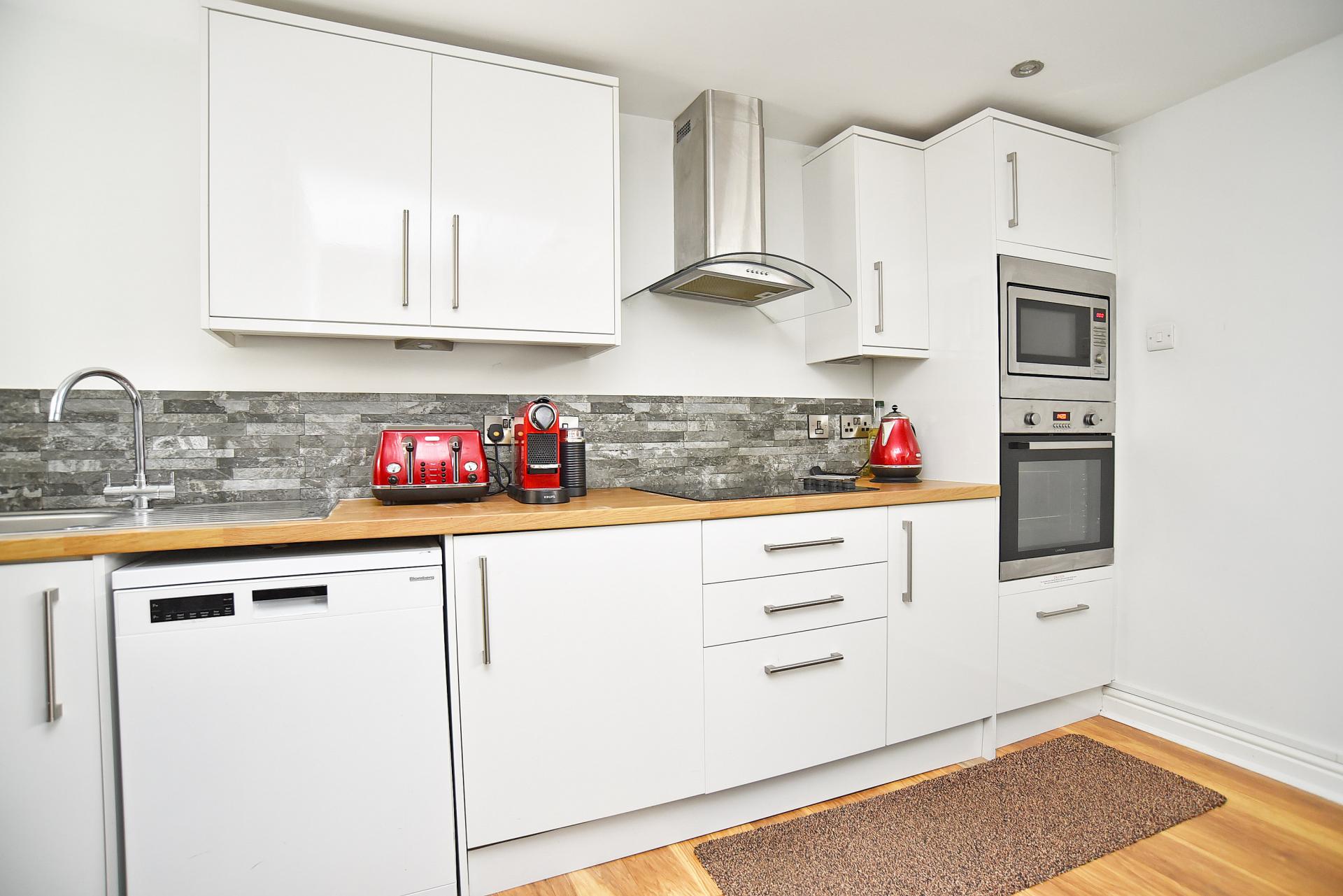 Fitted with a range of white wall and base units. Integrated fridge, plumbing for washing machine, and built-in oven, microwave oven and ceramic hob