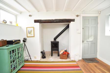 With laminate wood flooring and alcove. Electric heater and log burner. Windows to sides.