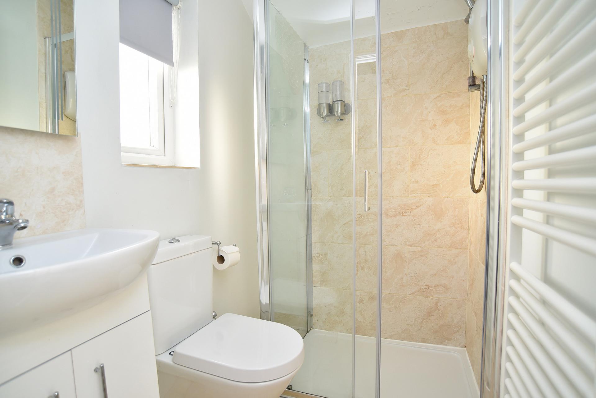 White suite comprising low-flush WC, washbasin and shower. Window to side, modern tiling and heated towel rail.