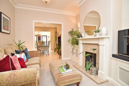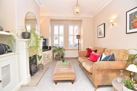 A spacious reception room with window to the front featuring fitted shutters. Attractive fireplace with living flame gas fire and bespoke fitted shelving and cabinets.