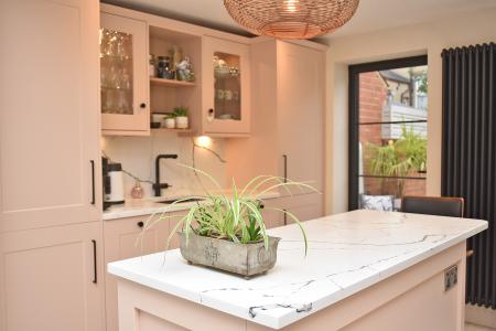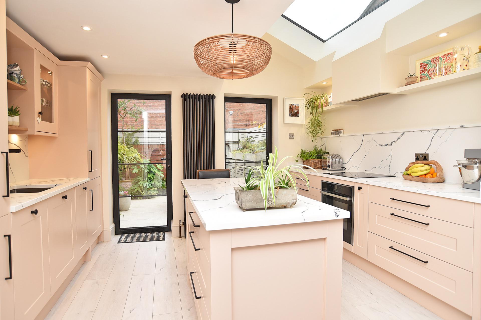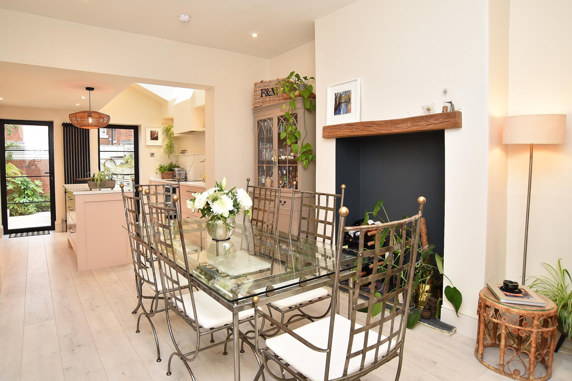 A stunning open-plan kitchen comprising a large skylight and Crittall-style doors opening onto the south-facing courtyard garden. The kitchen comprises a range of stylish wall and base units, with island and Quartz worktops. Integrated appliances include a Neff self-cleaning oven, induction hob, overhead extractor, dishwasher, fridge/freezer and washing machine. Stainless steel inset sink with pull-out mixer tap. Dining area with oak beamed fireplace. Large understairs pantry cupboard. Ceiling recessed LED dimmable lighting. Designer radiators.