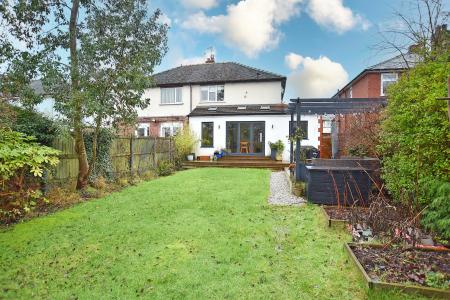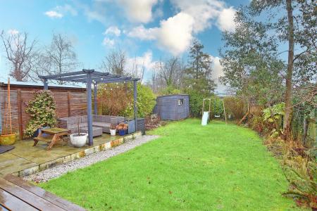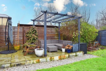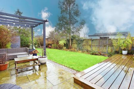 OUTSIDE Externally, the property enjoys a generous and well-maintained rear garden offering an excellent balance of lawn and seating areas. A paved patio provides space for outdoor dining, complemented by a raised timber deck and a pergola-covered seating area creating a sheltered spot for relaxation. The lawn extends beyond and is bordered by established planting and mature trees, offering a pleasant degree of privacy. The garden is fully enclosed and particularly well suited to families and those with pets, with a useful shed providing additional storage. To the front of the property there is driveway parking.