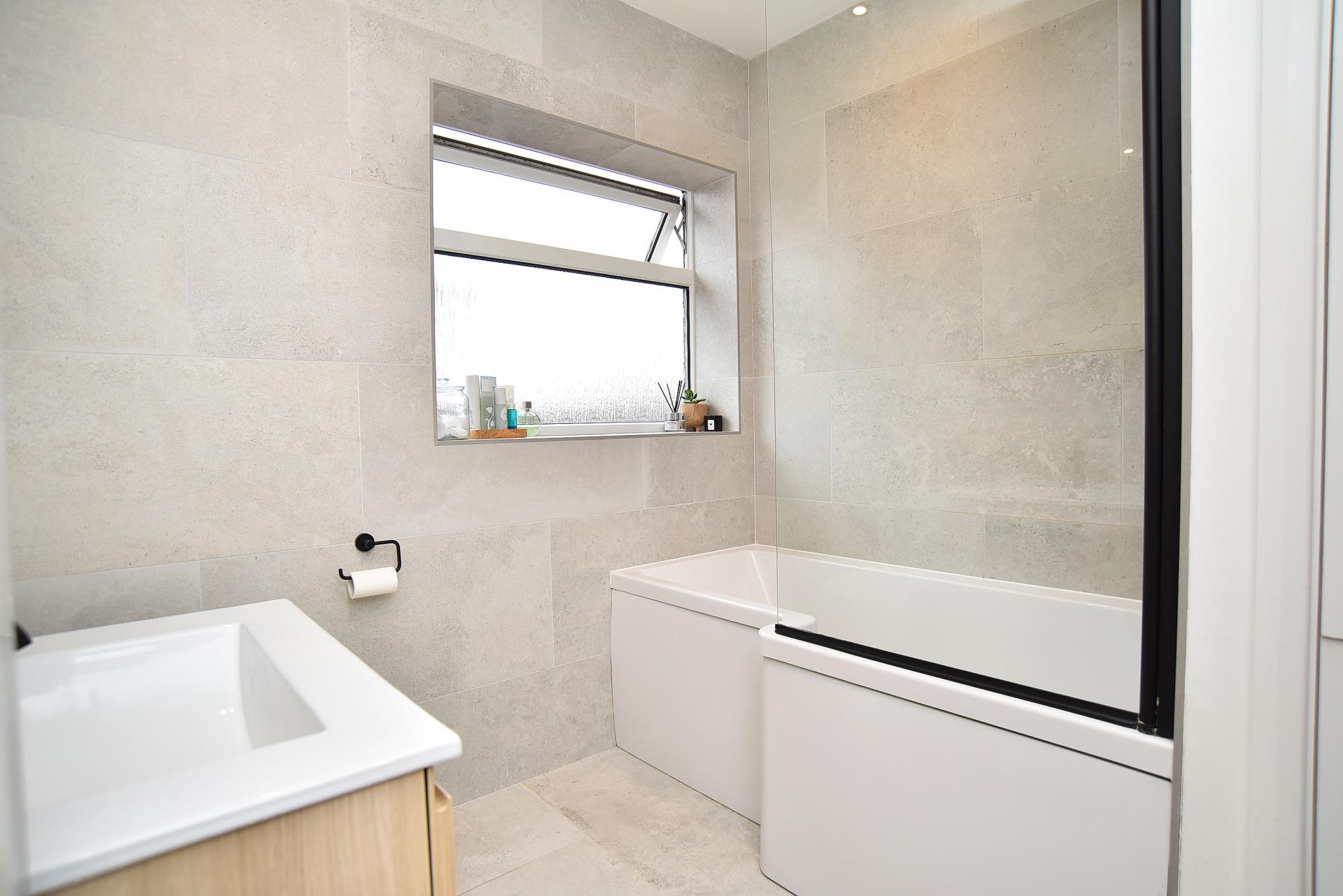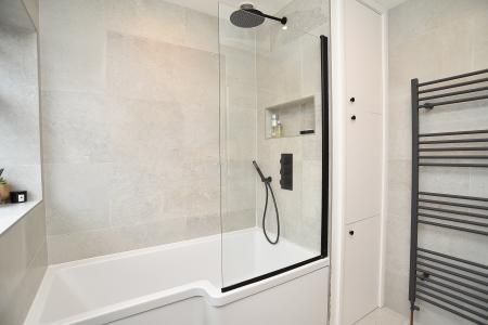 The house bathroom has been stylishly updated and finished to a high standard, comprising a panelled bath with glazed screen and overhead rainfall shower, a wash hand basin set within a modern vanity unit, and a low-flush WC. Contemporary tiling, a recessed wall niche and a heated towel rail enhance both the aesthetic and practicality of the space, while a frosted window allows for natural light and ventilation.