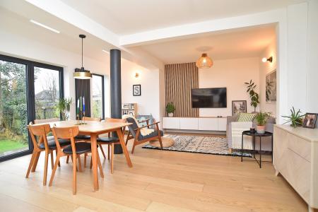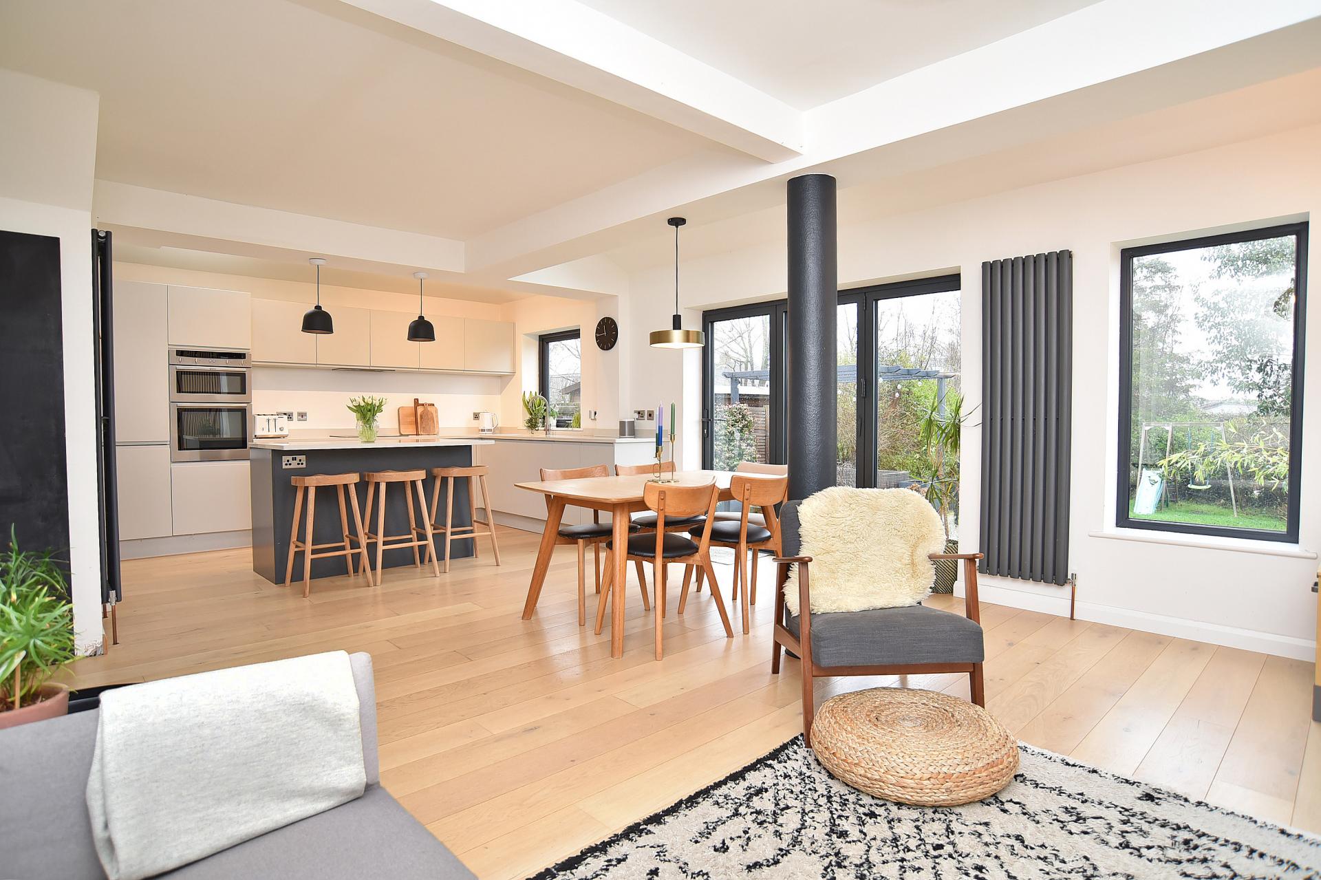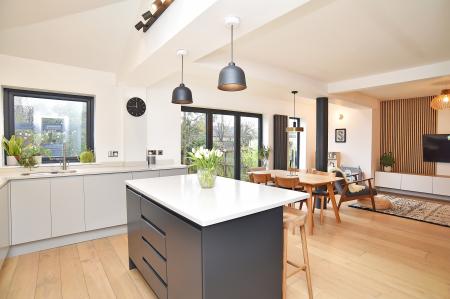 Undoubtedly, the heart of the home is the impressive extended open-plan living dining kitchen, thoughtfully designed with modern family life in mind. The kitchen is fitted with a range of contemporary wall and base units with complementary work surfaces and integrated appliances, offering both style and functionality. The layout flows seamlessly into generous dining and living areas, providing ample space for family gatherings and entertaining. Large glazed bi-folding doors open directly onto the rear garden, creating a wonderful connection between inside and out and allowing natural light to flood the space.