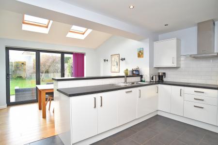 A stunning open-plan dining kitchen with bi-folding doors opening onto the rear garden. The kitchen comprises a range of modern fitted units with integrated appliances and ample space for dining.