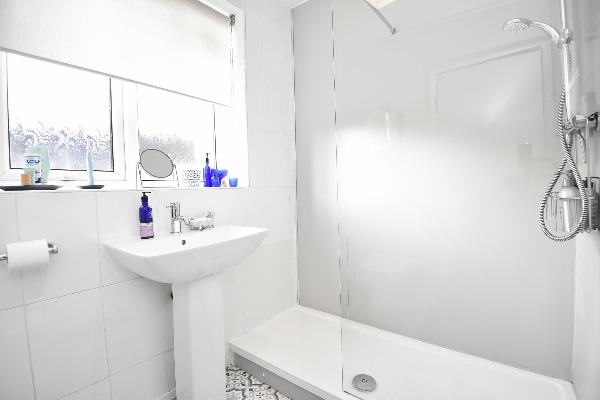 A modern white suite comprising WC, basin and shower. Heated towel rail. Fitted cupboard.