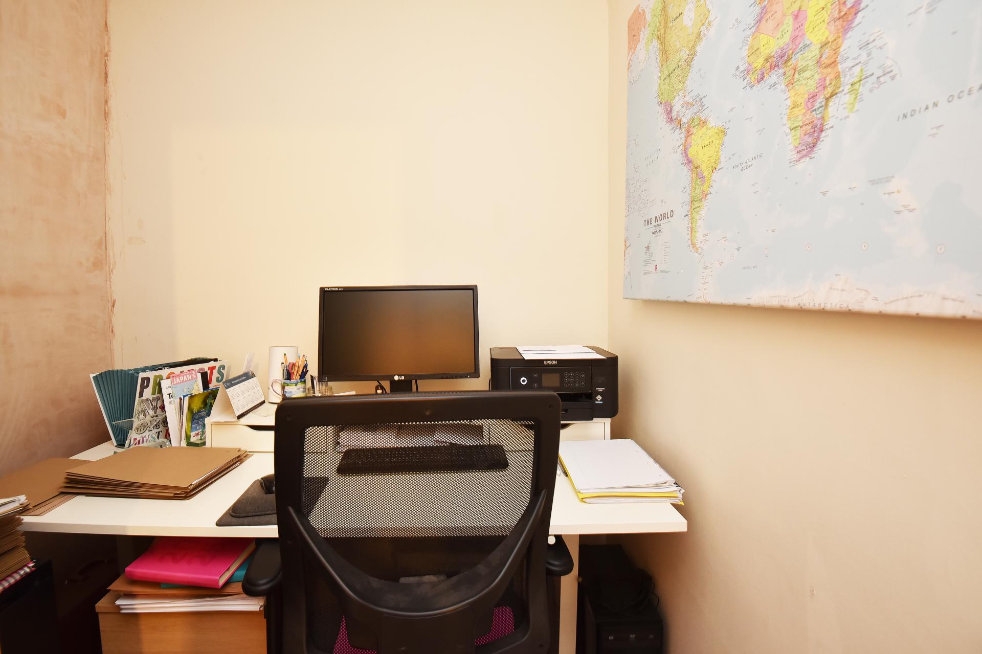 A spacious reception room with window to front with fitted shutters. Attractive fireplace. Fitted shelving and cupboards.