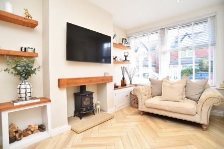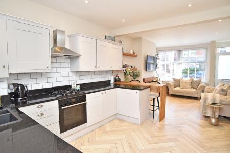 A stunning open-plan kitchen and living space with woodburning stove, windows to the front and rear, and door leading to the garden. The kitchen comprises a range of quality fitted units with granite worktops, gas hob, integrated oven and fridge/freezer.