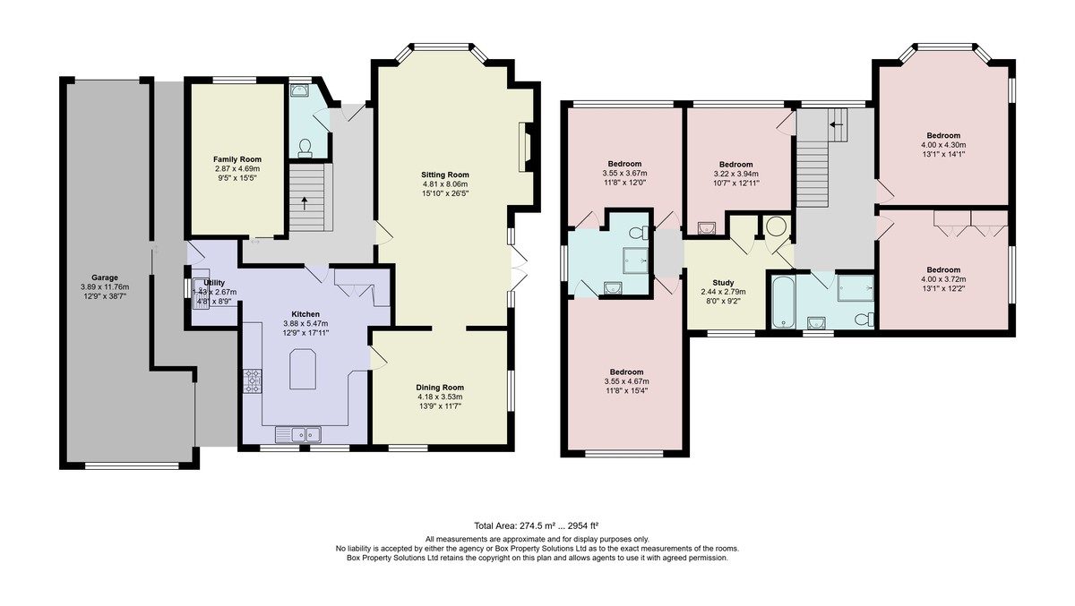 Upstairs, a light-filled landing leads to five good-sized bedrooms, study, house bathroom with separate bath and shower, and a Jack-and-Jill en-suite shower room servicing two of the bedrooms.