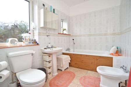 To the first floor, there are four well-proportioned bedrooms, several benefiting from fitted wardrobes. Bedrooms one and two are particularly generous in size, with bedroom two enjoying pleasant views across the rear garden and adjoining playing fields. The remaining bedrooms offer flexibility for family use, guests or home working. The house bathroom is fitted with a white suite comprising a panelled bath, washbasin, WC and bidet, together with a separate shower enclosure and a window providing natural light and ventilation.