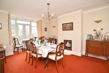 The ground floor is entered via a generous reception hall with a ground floor WC, creating a strong and welcoming first impression. The principal lounge is a spacious and refined reception room featuring a large bay window, decorative coving and a feature fireplace. A separate formal dining room provides an excellent setting for both everyday dining and more formal entertaining. The kitchen opens through an archway into a dining area, with double doors leading out to a paved seating area, offering an excellent flow between the interior and the garden.