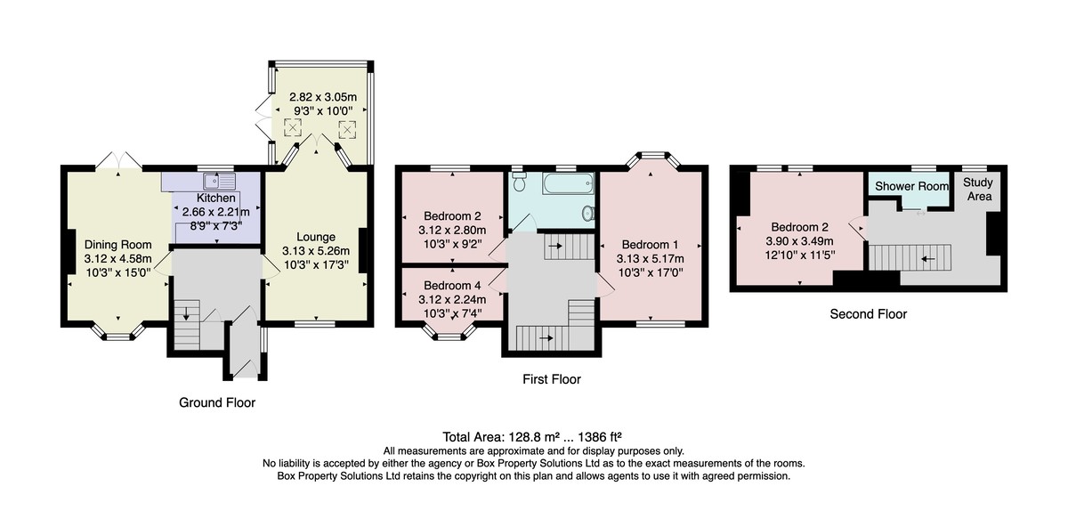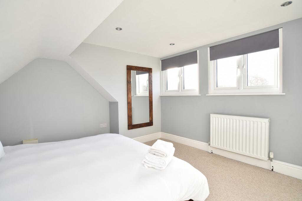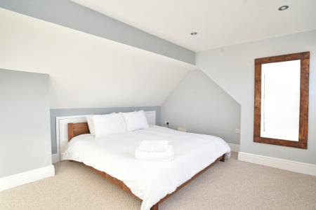 Two double-glazed windows to rear. Modern suite comprising low-flush WC, pedestal washbasin and panelled bath with mixer taps and shower attachment. Fully tiled to three walls and three large wall-mounted mirrors. Chrome heated towel rail and tiled floor.
