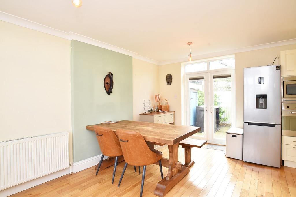 Double-glazed bay window to front with fitted seat. Double-glazed double French doors leading to the rear courtyard. Two central heating radiators. Open plan to –