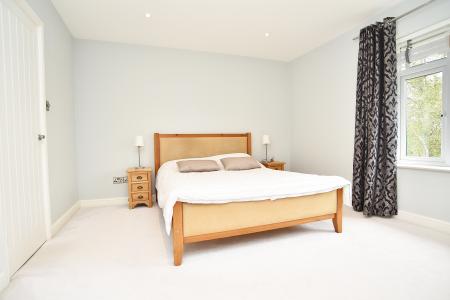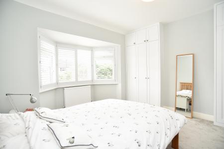 A double bedroom with bay window to the front with wooden shutters. Fitted wardrobes.