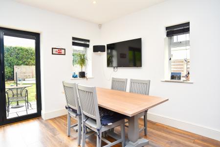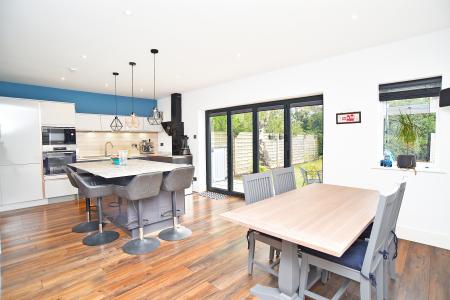 A stunning open-plan living space with spacious dining area and bi-folding doors leading to the garden. Stylish fitted kitchen with range of wall and base units with granite worktop, island and breakfast bar. Sink with Quooker boiling water tap. Induction hob with extractor hood above and integrated electric oven and microwave. Pantry with power and lighting. Integrated dishwasher and fridge / freezer. Under-floor heating.