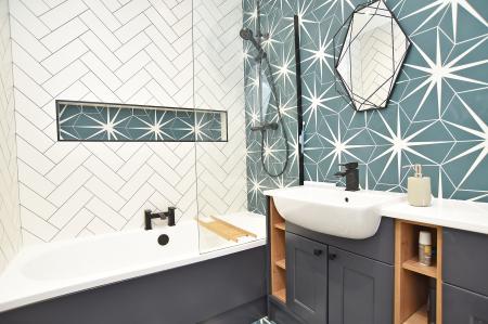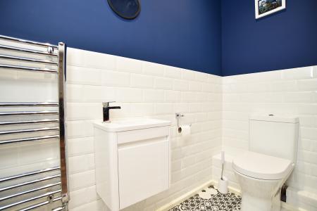 A modern white suite with low-level WC, washbasin set within a vanity unit, and shower. Tiled walls and floor, heated towel rail and window to rear.