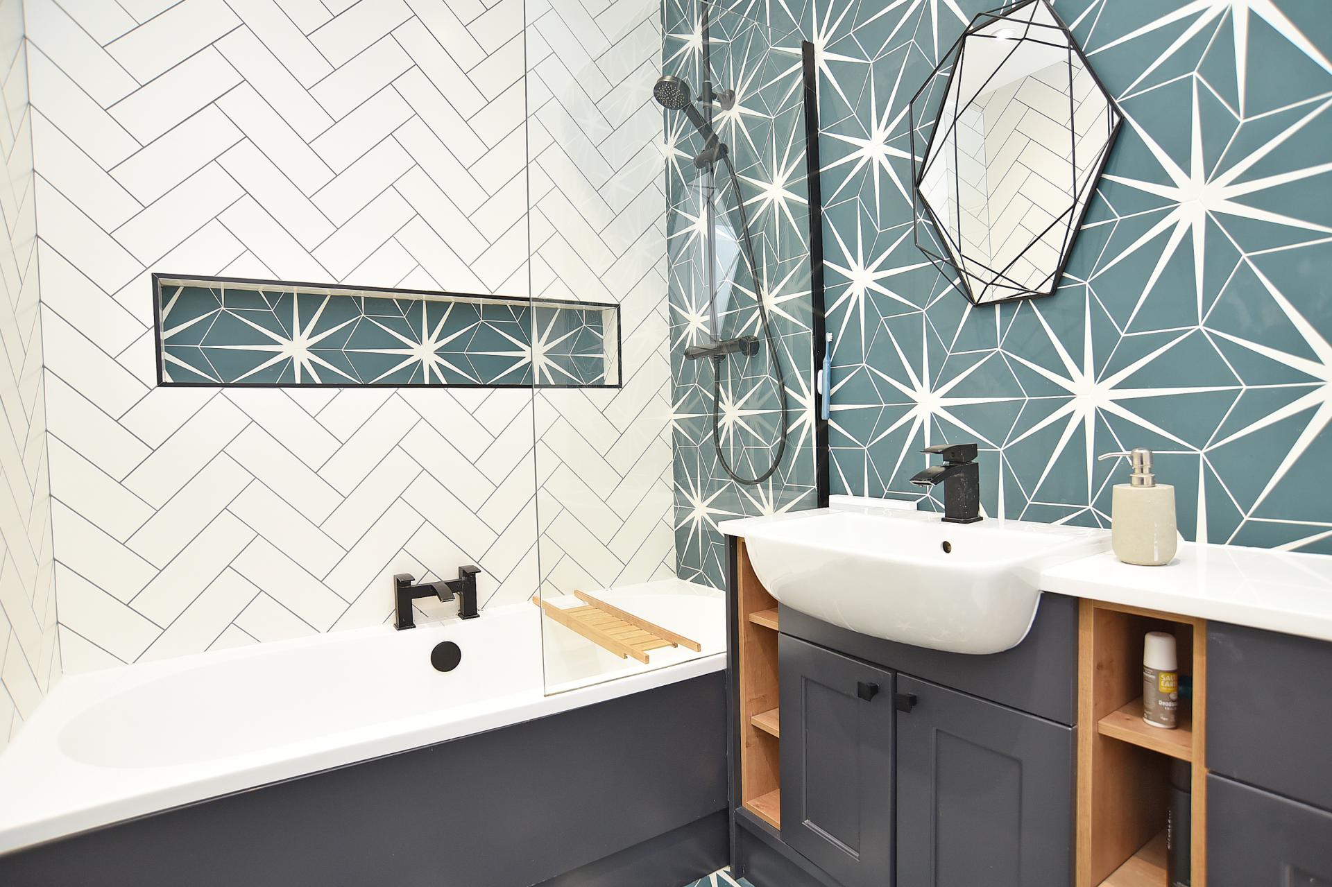 A modern white suite with low-level WC, washbasin set within a vanity unit, and bath with shower above. Tiled walls and floor.